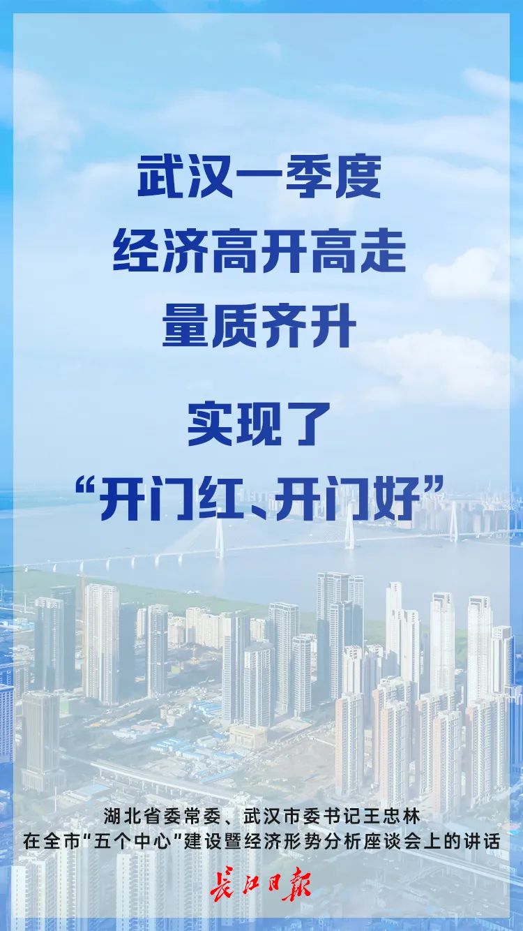 今年一季度,武汉市主要经济指标持续加快恢复。王忠林指出,一季度武汉经济恢复快、增长后劲强、发展质量好、产业结构优、民生保障实,呈现“高开高走、量质齐升”的态势,实现了“开门红、开门好”。在经济社会发展有力支撑下,“五个中心”建设统筹谋划高位推进、东湖科学城等功能项目加快实施、外交部湖北全球特别推介等活动带动城市形象持续提升,现代化大武汉建设成效明显。