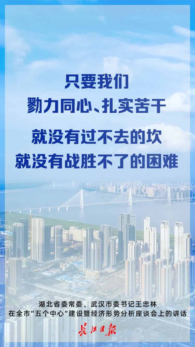 实现全年“双过半”,二季度是关键。王忠林要求,各级各部门必须始终坚持发展第一要务,把握发展、关注发展、推动发展。要强化经济运行调度,加强监测、分析、研判,精准施策确保经济平稳运行,做到“心中有数”;强化科技创新,紧扣国家科技创新中心目标,注重科技研发“筑根基”、集聚科技人才“强支撑”、用好科技成果“促转化”、深化科技改革“激活力”,以科技创新引领全面创新,加快推进动能转换;强化产业支撑,按照“965”产业集群发展思路,用好“产业地图”,建立完善产业链“链长制”,坚持“亩均论英雄”,做好“稳、转、进”三篇文章,突破性发展数字经济,做实做强做优实体经济;强化内需拉动,千方百计促消费,更大力度抓好招商引资,扎实推进项目建设,切实增强发展后劲;强化“一主引领”,做强自身龙头地位,引领武汉城市圈同城化发展,辐射带动区域发展;强化服务提升,对标世界银行营商环境评价体系,减环节、压时限、降成本,推动服务再提质、改革再深化,打造一流营商环境;强化民生保障,以绣花功夫做好稳就业、补短板、优生态各项工作,展现好武汉大江大河大湖的城市风貌,不断提升城市温度。