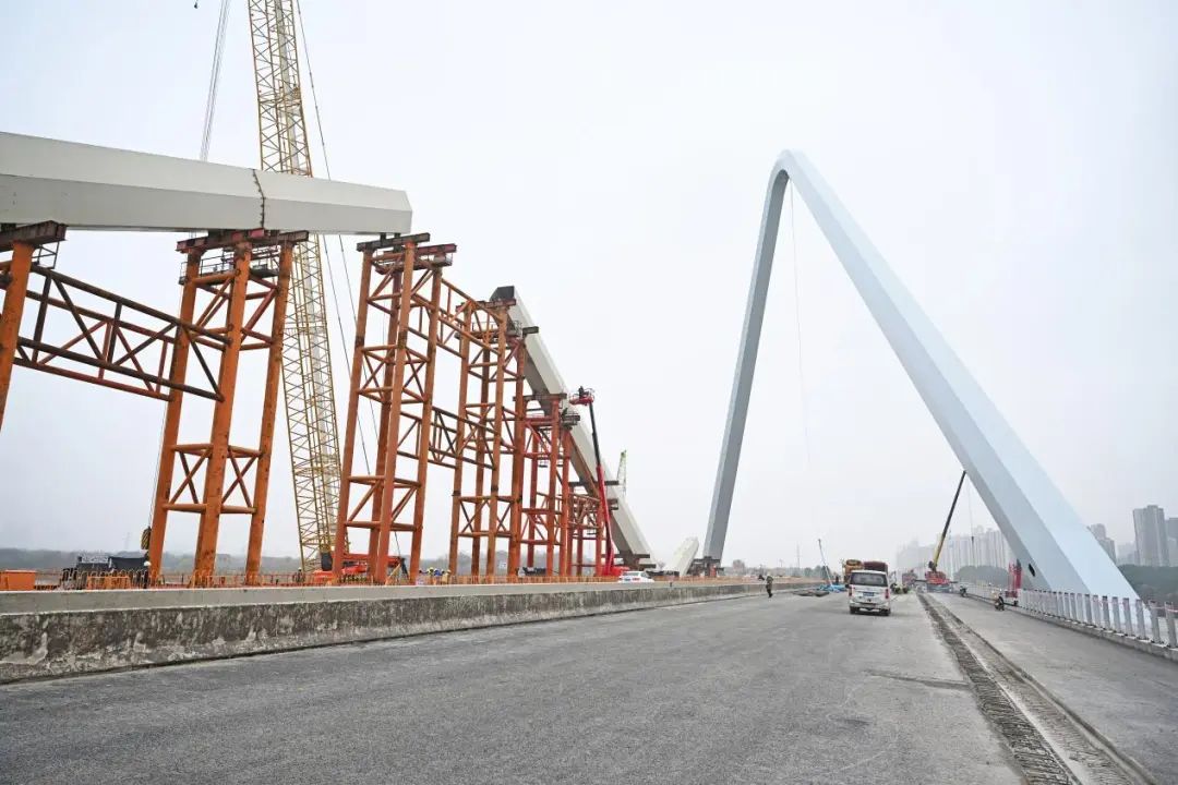 记者在现场了解到,两家项目建设单位都在紧锣密鼓开展施工作业。按照设计方案,主桥上面需要建设两片拱肋,其中一片跨度较大的拱肋已经建成,另一片拱肋即将合拢。中铁大桥局现场施工相关负责人介绍,目前扩建桥梁已全部贯通,正在开展护栏及人行道地砖铺设等附属设施收尾工作。中建三局方面也已经进入收尾工作,确保高新大道改造工程(含短咀里湖2号桥)按照时间节点,12月28日达到通车条件。