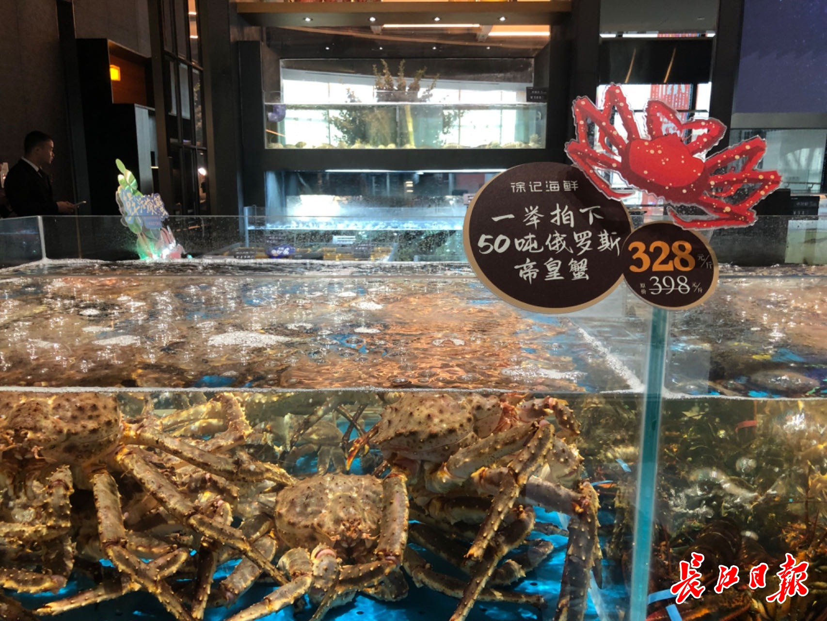 记者现场看到,因为徐记海鲜总部从俄罗斯直接采购了数十吨帝王蟹,武汉徐记海鲜餐厅里的俄罗斯帝王蟹从原来的每斤398元降到了每斤328元。
