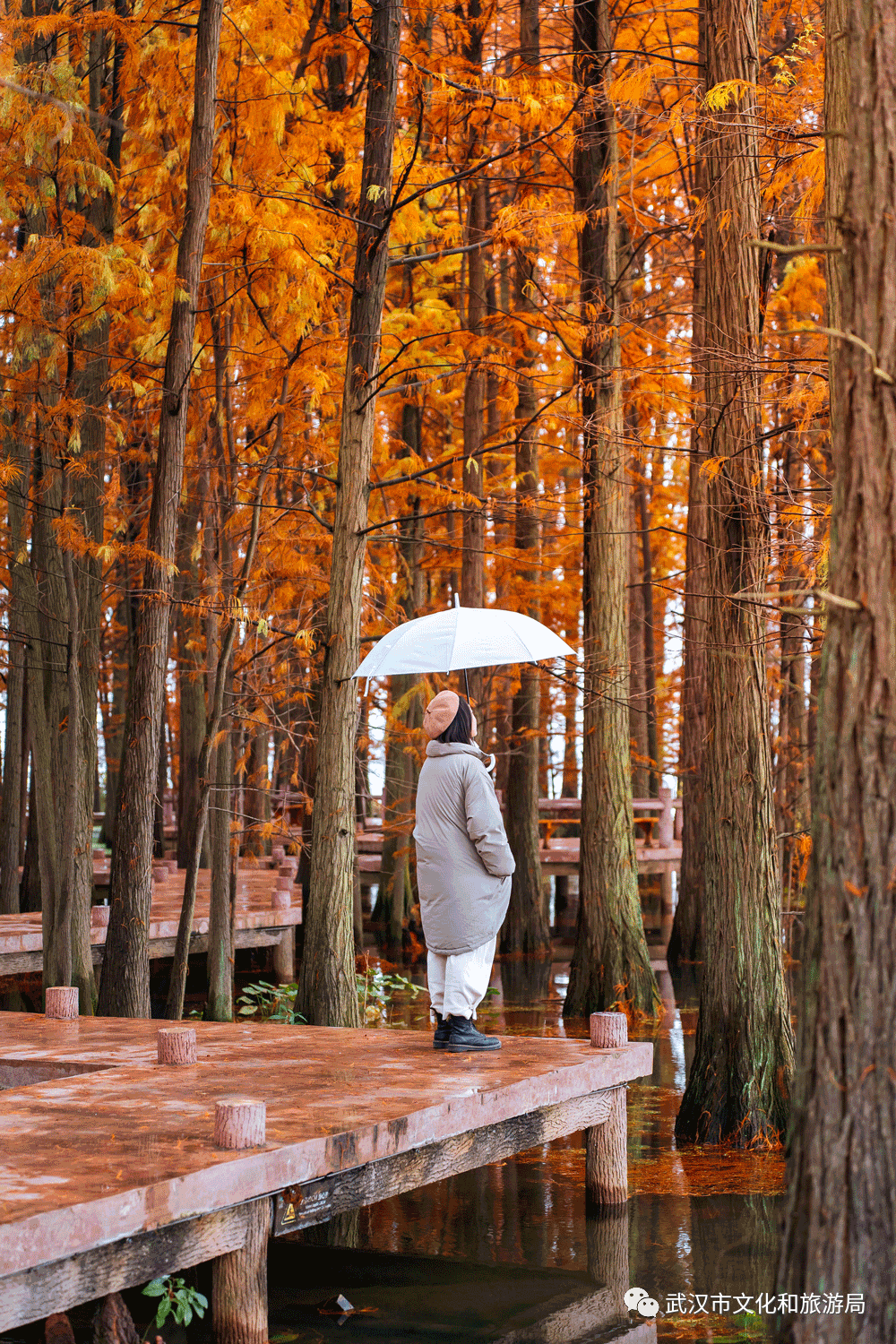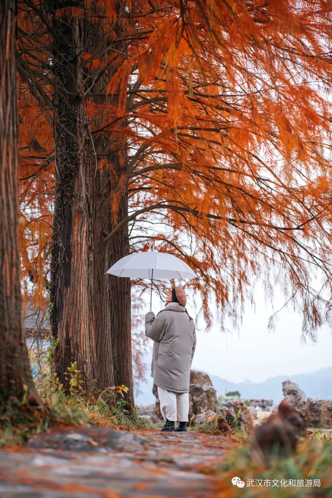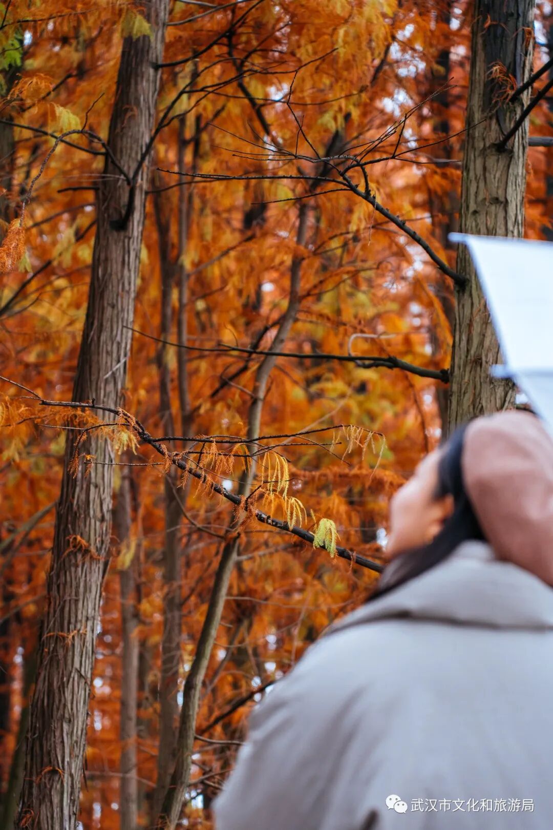 杉树是最大的显眼包,沿着湖岸成排而立,用红棕色给东湖勾了个边。在「雁洲索桥」你能拍到这片红色森林的全景。
