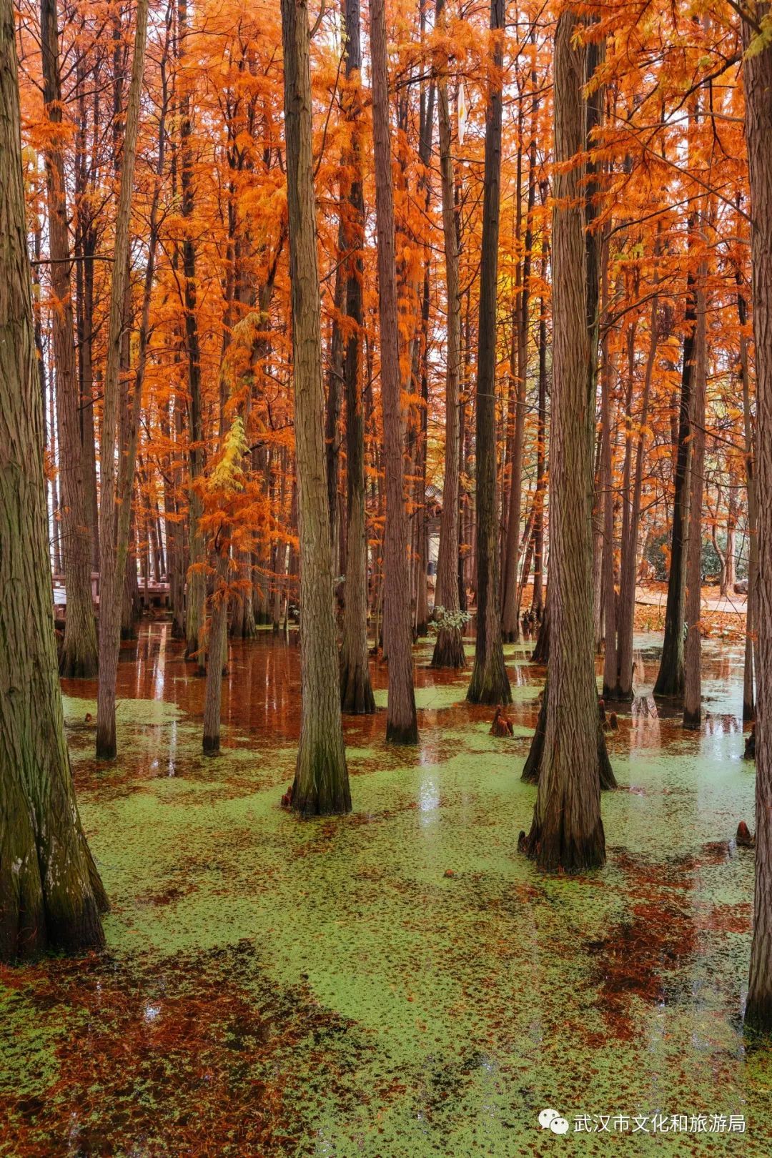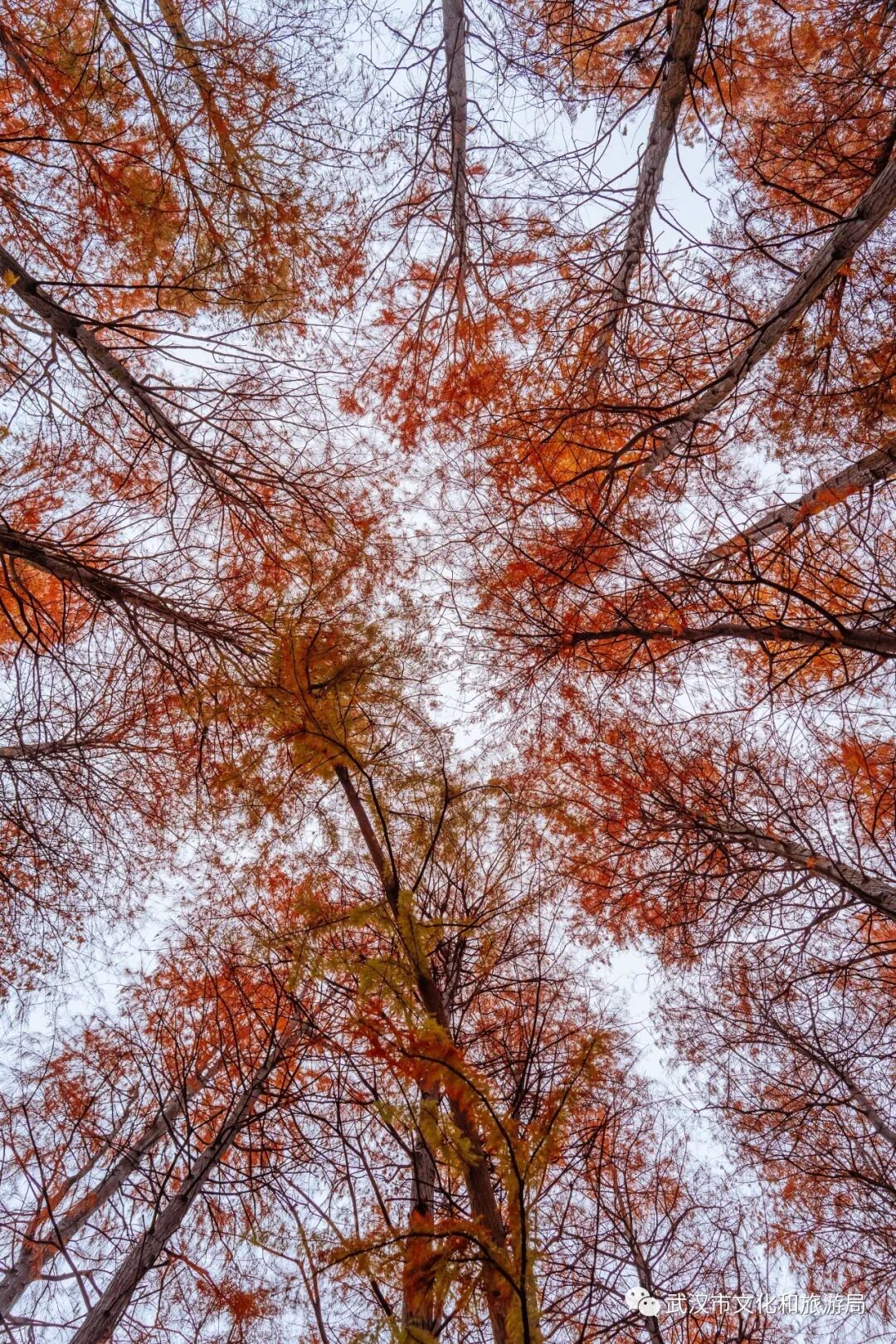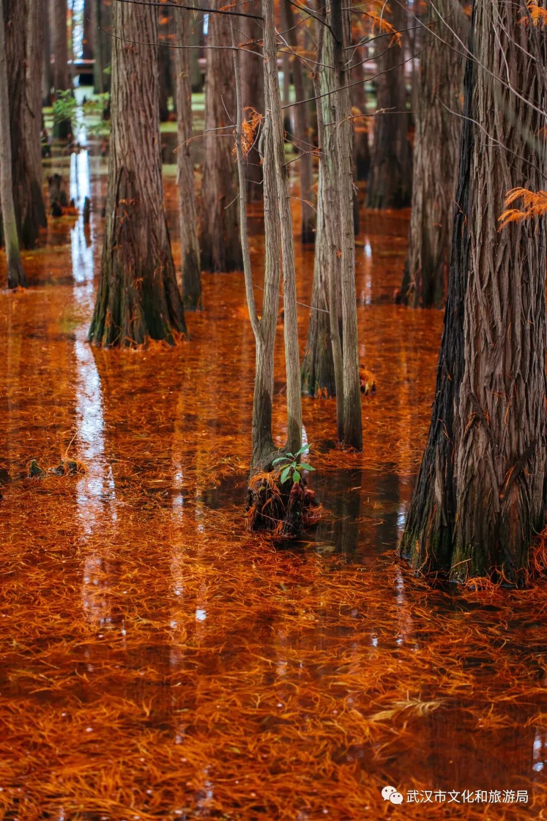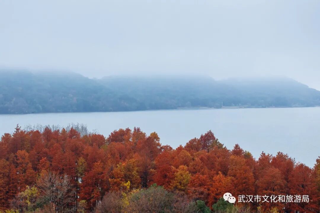 杉树是最大的显眼包,沿着湖岸成排而立,用红棕色给东湖勾了个边。在「雁洲索桥」你能拍到这片红色森林的全景。