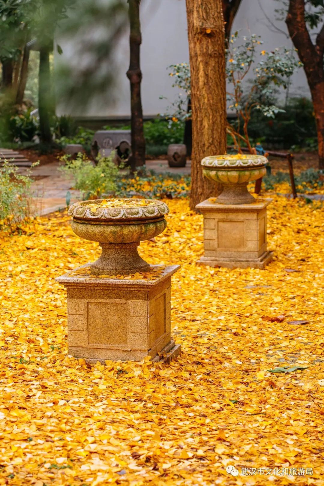 每年秋天,三棵银杏古树把整座花园点亮,即便是阴天,这片花园依旧散发着暖光。如今银杏叶已经落尽,却保留了大片金黄的树叶地毯。