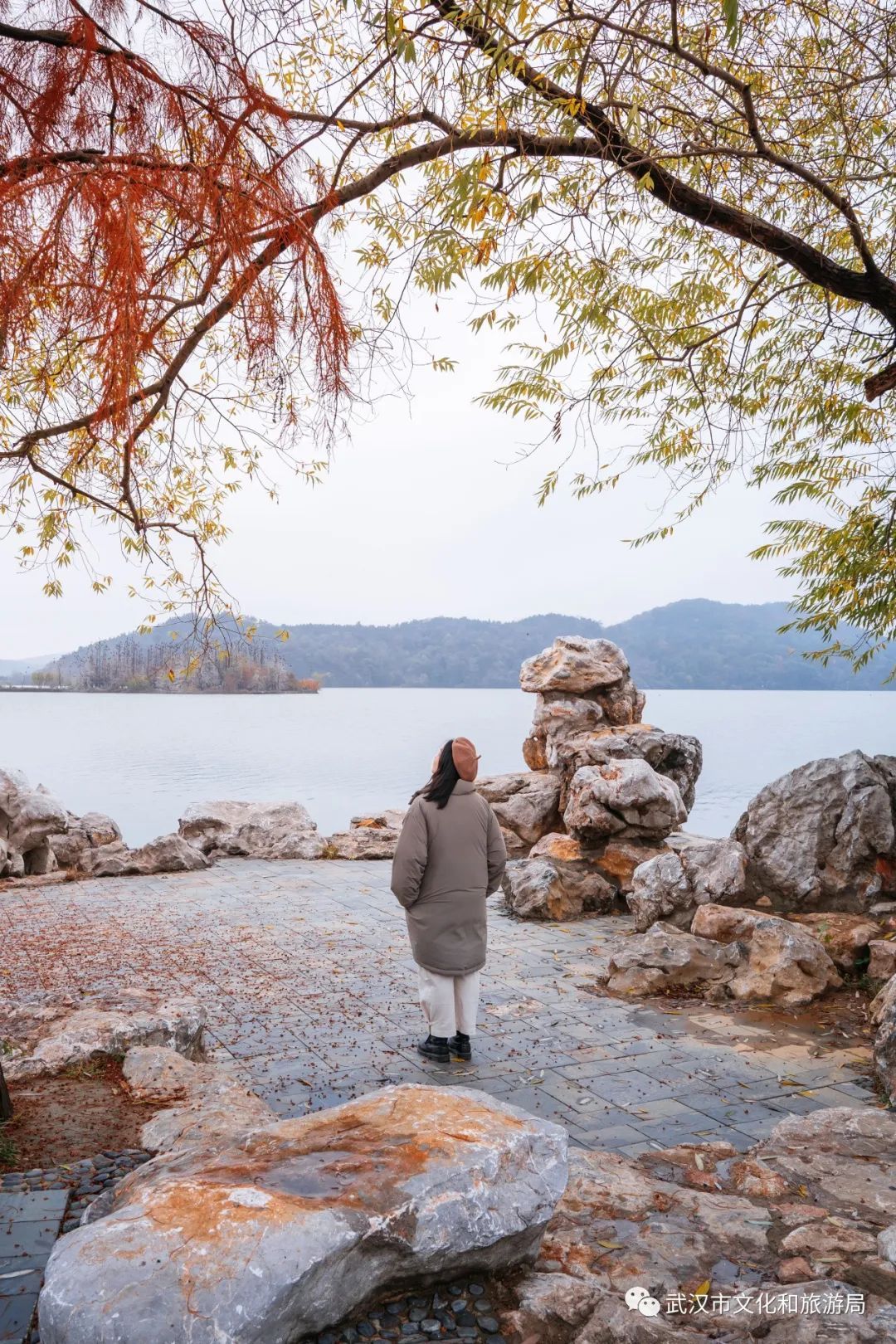 若是晴天来,推荐你们在附近的「叠石观涛」景点等一场日落。这里距离对岸磨山有2500米远,东湖此刻如海般宽阔。