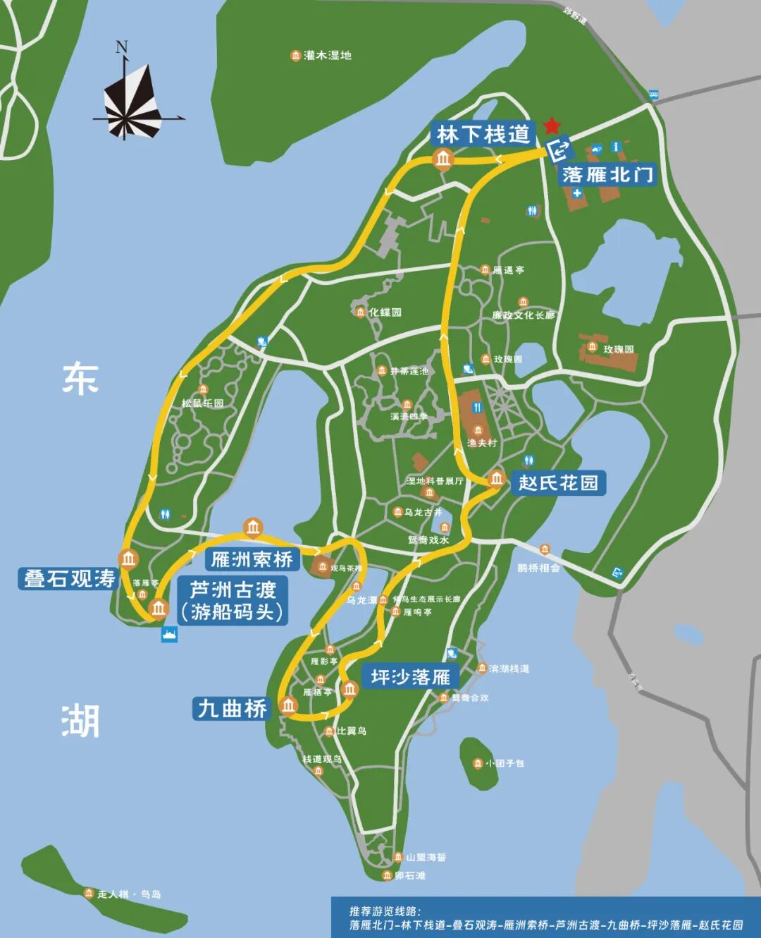 落雁北门-林下栈道-叠石观涛-雁洲索桥-芦洲古渡-九曲桥-赵氏花园