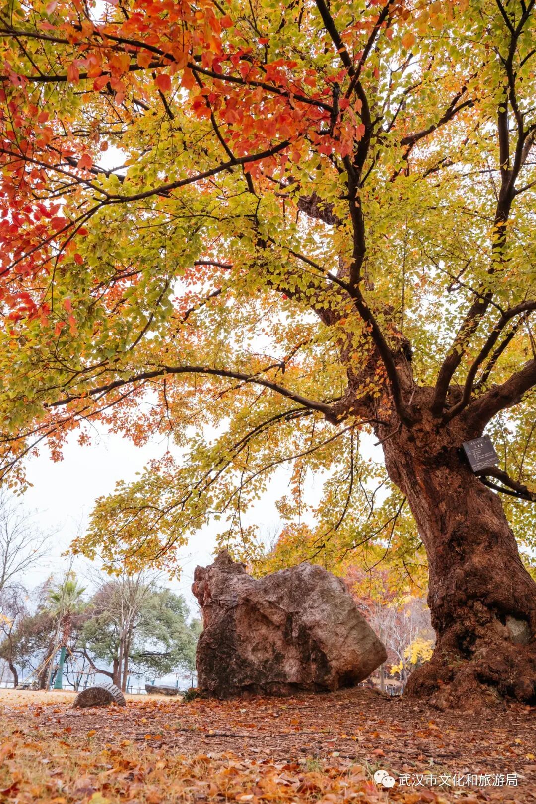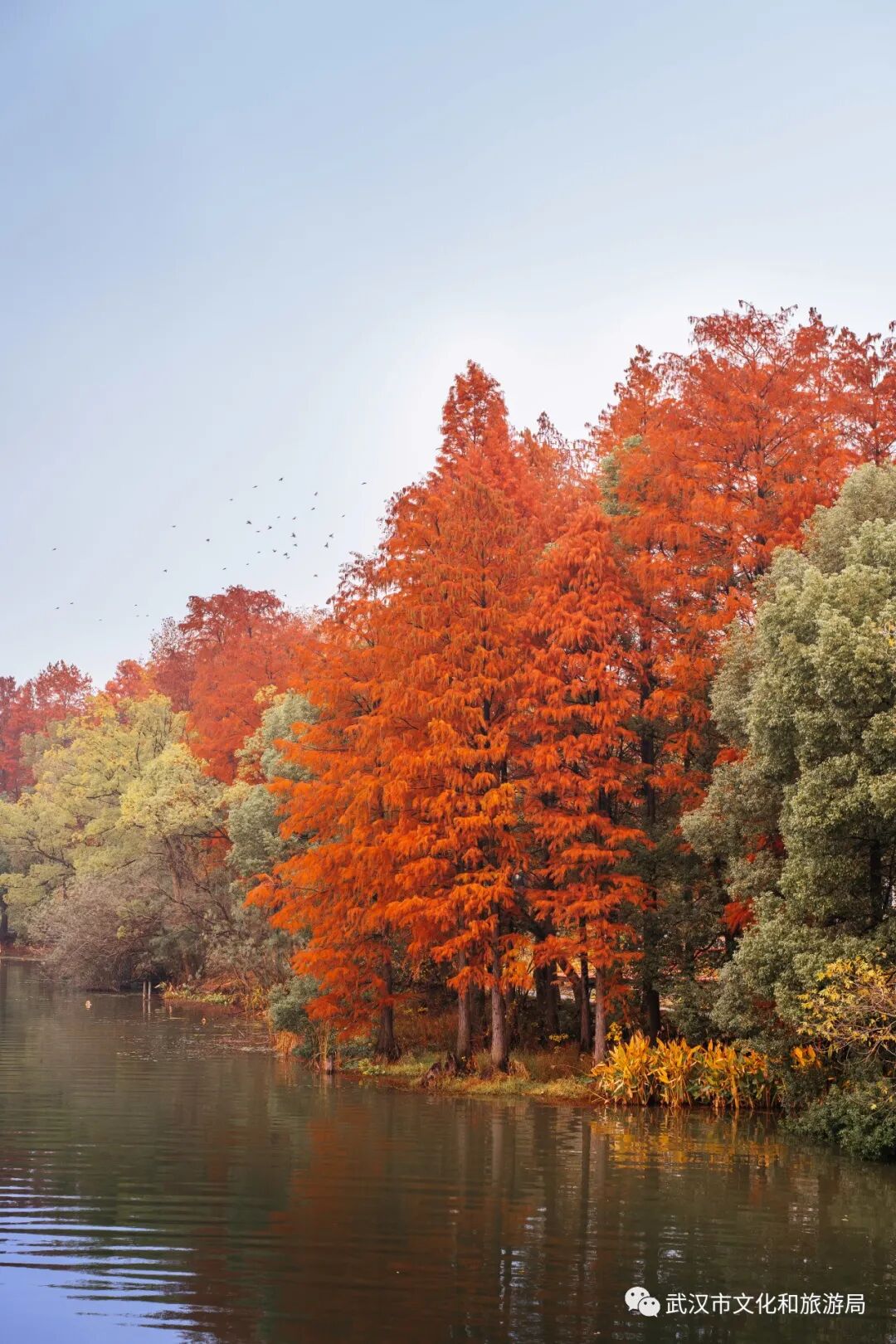 秋冬来临,彩叶植物一齐变色,落雁就成了东湖最缤纷的所在。落雁对面的小岛,还能看到千鸟归巢的壮观画面。