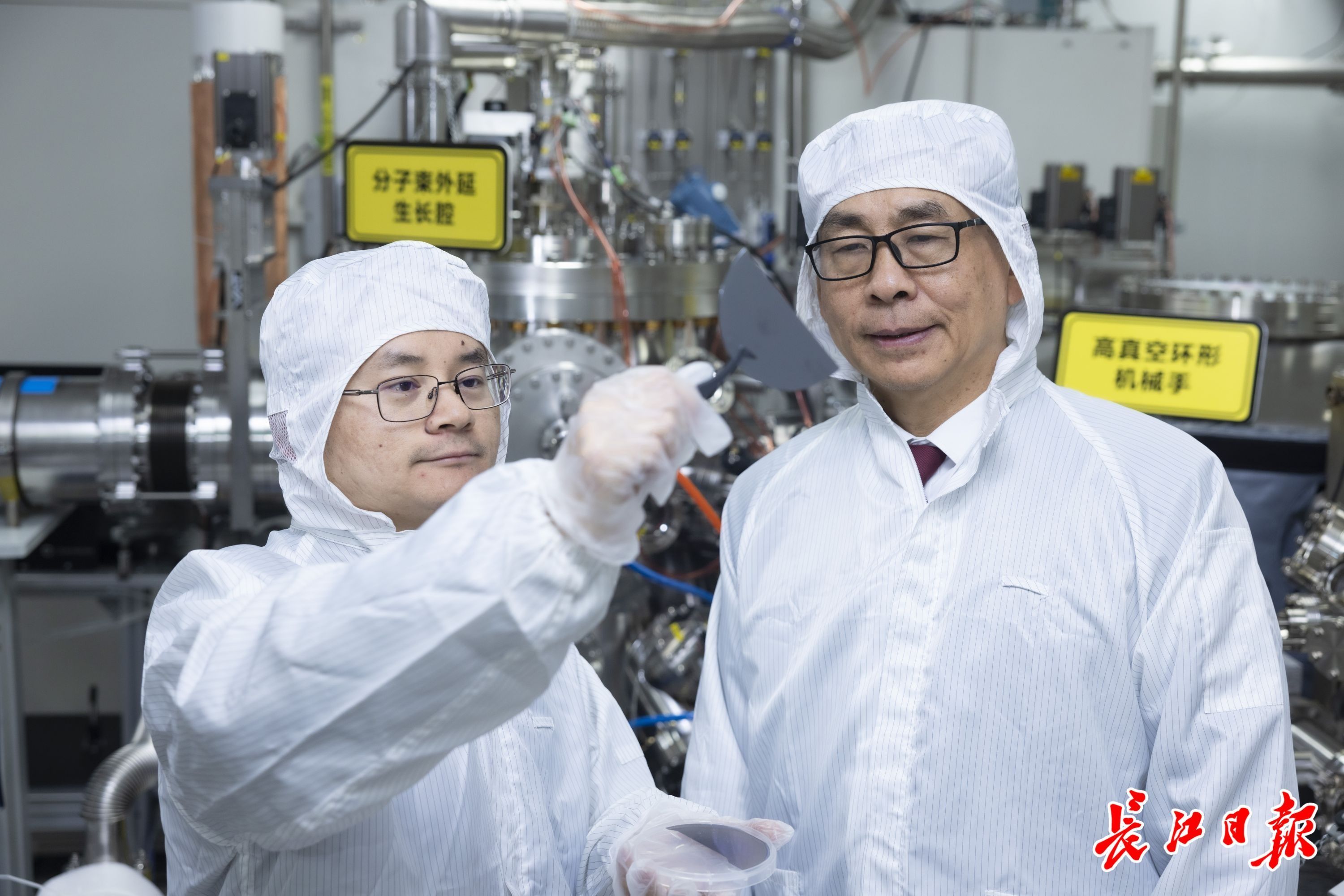 12月10日,中国科学技术大学微电子学院特任教授孙海定从合肥来武汉见恩师。在薄膜生长实验装置前,他与刘胜合影留念。