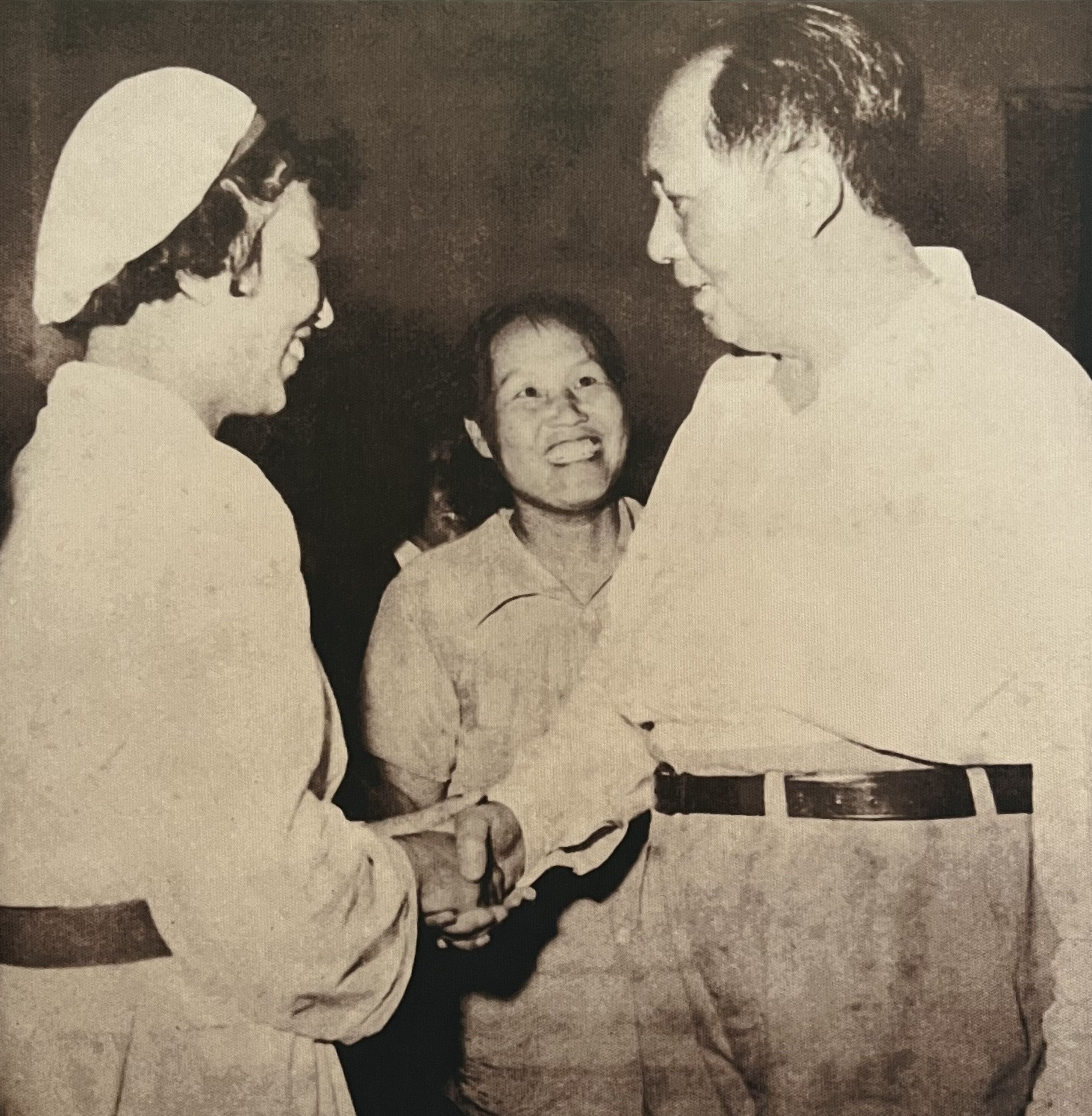 1958年9月14日,毛主席在接见武汉市妇女代表时,与邱益英(左)握手。长江日报记者高文举 翻拍