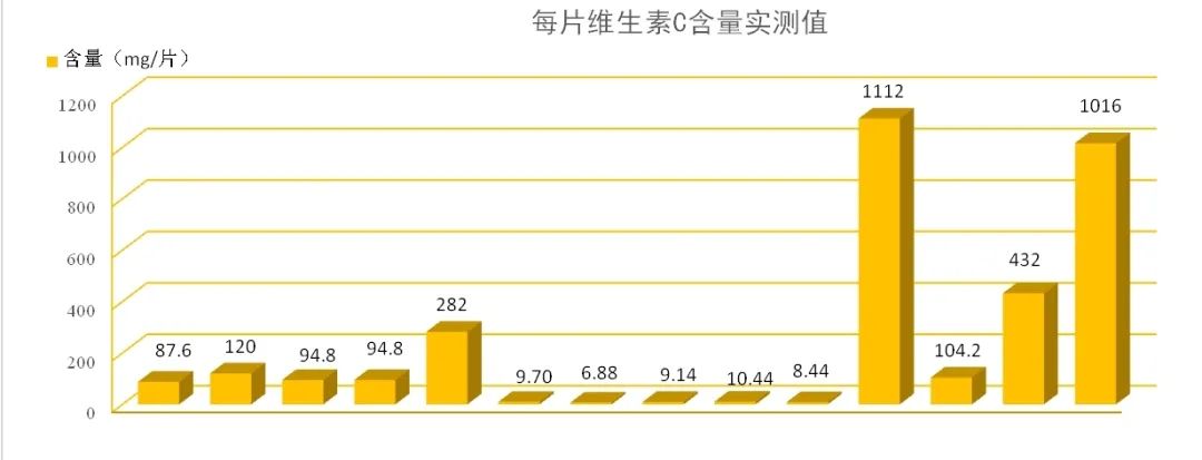 计算发现,14款泡腾片中有2款的维生素C每日摄入量接近《中国居民膳食营养素参考摄入量(2018)》中维生素C每日适宜摄入量的一半,换言之,每日一片泡腾片就已经达到了适宜量的一半以上,而这还未包括其它蔬菜、水果等食物维生素C的摄入。