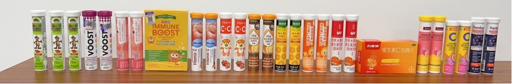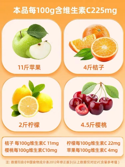 这次购买的泡腾片大多宣称可有效补充每日所需的维生素C,不少产品都将自己和水果含的维C含量相比较,比如“一片的维生素C含量相当于X个苹果、X个橙子、X斤樱桃……”