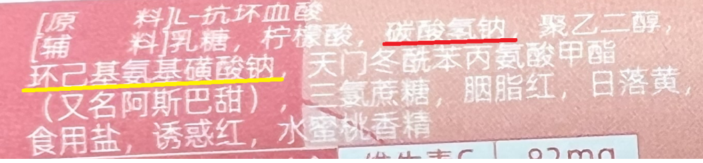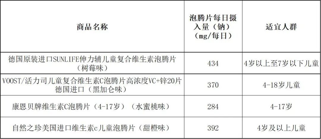由于VEGTOMETO/维格美维生素C泡腾片(草莓味)在网页宣传中“建议早晚各一片冲泡饮用”,且宣传老人和儿童都适用。因此这款泡腾片按每日2片的服用量计算,每日钠摄入量为976 mg。然而,4岁以上儿童钠AI为900 mg/每日,如果给4岁以下的儿童服用的话,每日钠摄入量是偏高的。