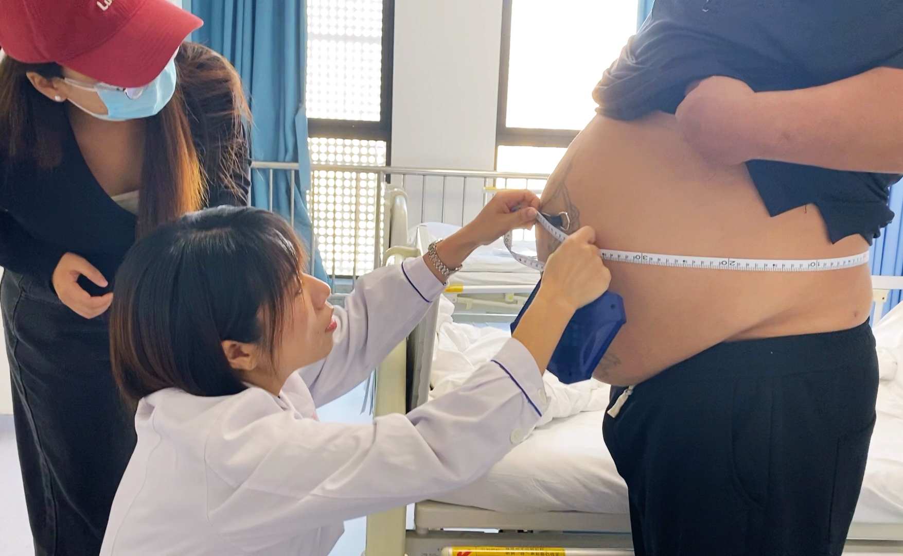 术前,个案管理师秦慧帮李先生测量腰围达150cm。