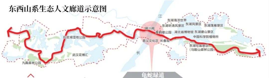 ○ 东西山系生态人文廊道,西起九真山,东至九峰山,长108公里,涵盖山系48座,湖泊、河渠27条。(图/武汉绿化)