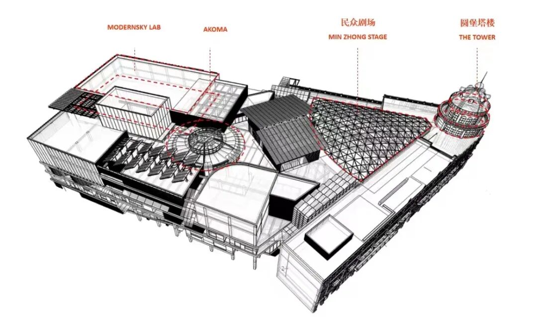 按照规划,今年开放后的民众乐园,将成为融合音乐与艺术的青年文化阵地。这里将有嘻哈音乐主题俱乐部AKOMA,将IVEHHOUSE和艺术空间融合的MODENSKY LAB,以及传承和延续戏台文化的民众剧场。