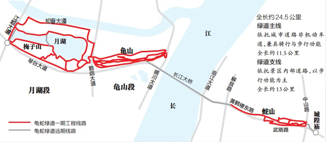 作为东西山系生态人文廊道项目的启动项目,龟蛇段一期工程西起江城大道,东至蛇山首义公园,全长约24.5公里,预计2024年12月完工。 绝妙的是,这是来武汉必打卡的经典旅游路线。绿道经过武汉长江大桥、龟山电视塔、黄鹤楼、月湖公园、首义公园等地标,到时候,游客可以用骑行解锁“龟蛇锁大江”的壮景。