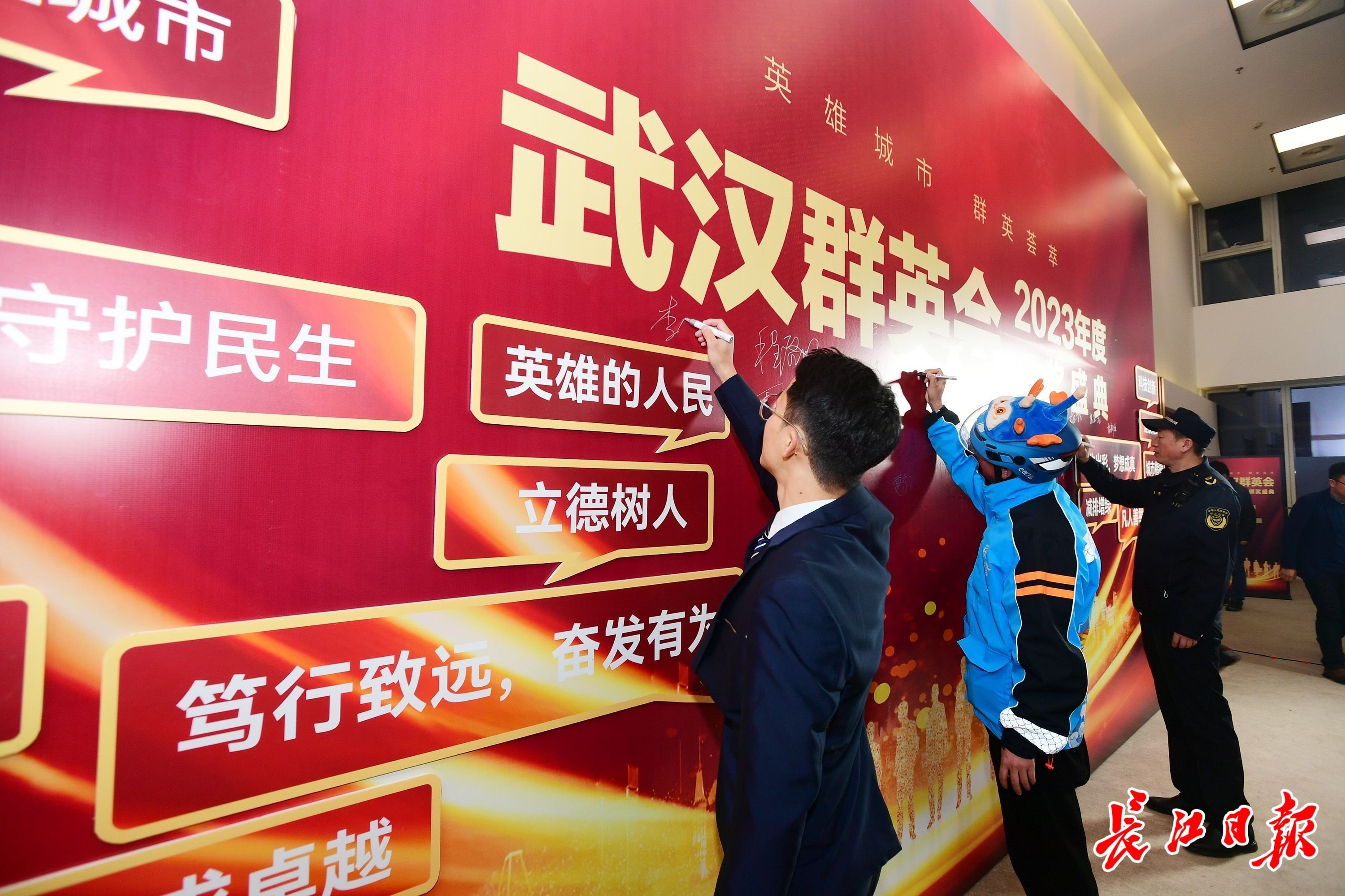 2023年度“武汉群英会”先进人物代表在签名墙上签名。长江日报记者 李永刚 胡冬冬 史伟 摄