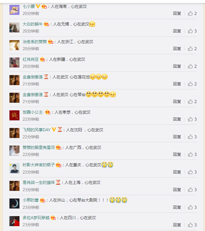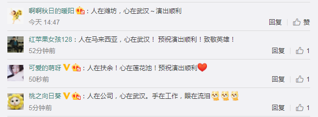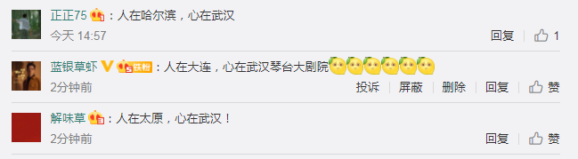 长江日报4月22日讯 “人在新疆,心在武汉”“人在海南,心在武汉”“人在上海,心在武汉”“人在哈尔滨,心在武汉”……今天,在微博上,不少网友做起了填空题。不少网友虽然没在现场,但心却已飞到了武汉。来自全国各地的网友在场外为《如梦之梦》加油的同时,还表达了对#大武汉之夜如梦之梦#的祝福。