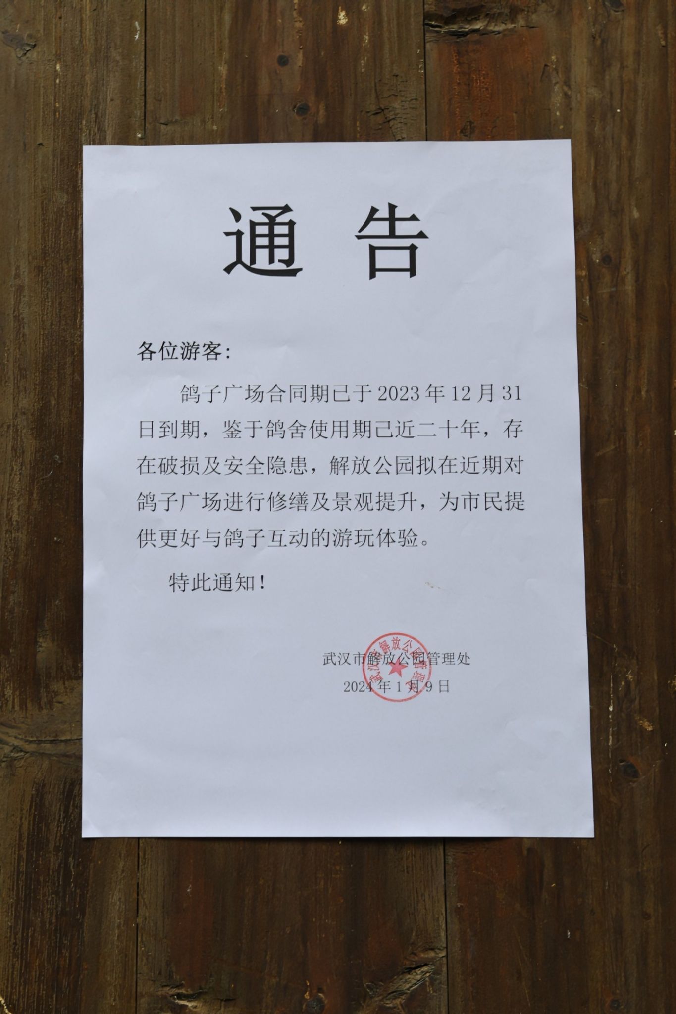 9日10时许,解放公园管理处工作人员来到现场,在鸽舍外墙张贴了《通告》,上书:鸽子广场合同期已于2023年12月31日到期。鉴于鸽舍使用期已近二十年,存在破损及安全隐患,解放公园拟在近期对鸽子广场进行修缮及景观提升,为市民提供更好与鸽子互动的游玩体验。