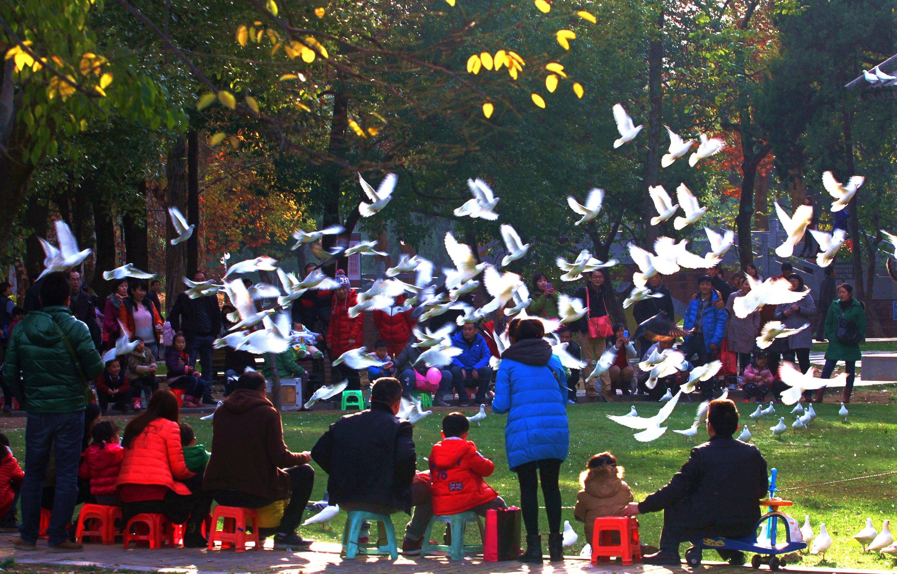 市民在解放公园鸽子广场拍照留念。 陈璐 摄