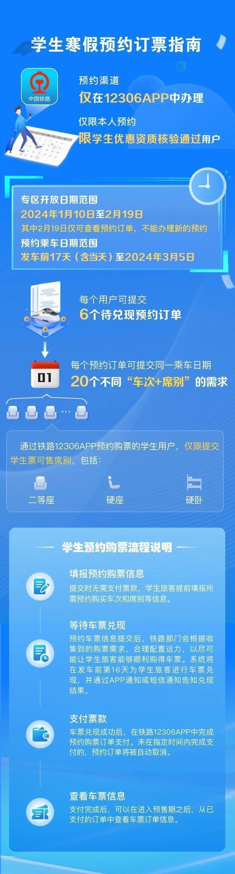 铁路12306科创中心相关负责人介绍,为认真贯彻落实党中央国务院关于做好2024年元旦春节期间有关工作的要求,保障学生、务工人员等重点群体春运出行,铁路12306创新服务举措,为学生、务工人员推出了售票服务专区。自1月10日起,符合条件的学生旅客(已通过学生优惠资质核验且有剩余优惠乘车次数)可通过“学生寒假订票专项服务”专区预约购买春运期间(1月26日至3月5日)火车票,每名旅客最多可同时提交6个预约订单,每个订单可添加1个乘车日期的20个“车次+席别”的组合,可选席别为学生优惠票适用的硬座、硬卧、二等座。已通过实名制核验的务工人员可通过“务工人员春运预约订票服务”专区预约购买春运期间火车票,每名旅客可同时提交6个预约订单,每个订单可选择“时间+车次+席别”的1个组合。