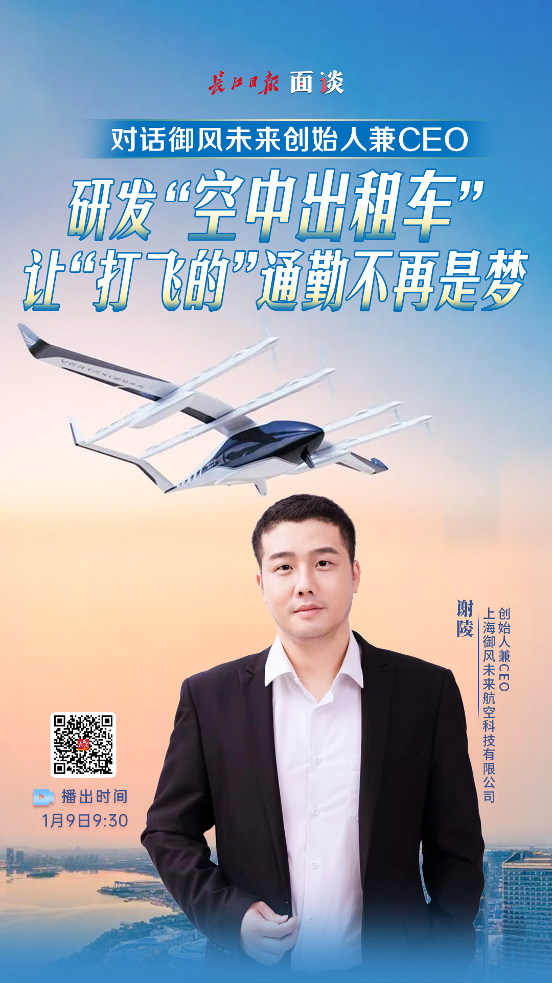 近日,“空中出租车”在上海首飞的话题登上热搜榜。御风未来公司自主研发的一架2吨级的载人“电动垂直起降飞行器”成功完成了首飞。未来它将用于满足城市内或城市间的短途空中出行需求,把2到3小时的车程缩短至30分钟左右。“空中出租车”有哪些特点?研发中克服了哪些难点?1月9日,上海御风未来航空科技有限公司创始人兼CEO谢陵做客《面谈》,讲述“空中出租车”的那些事儿。(点击下图看更多详情)