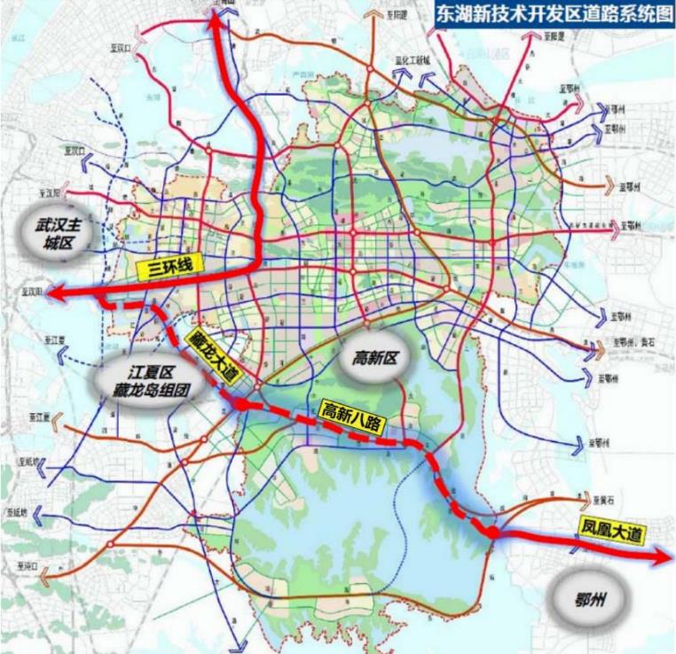高新八路是武汉都市圈核心区“三横三纵”快速道路系统中“横二”南通道的重要环节,道路贯穿武汉新城南部、龙泉山片区、梧桐湖片区,驱车可从东湖高新龙泉街道直抵鄂州。
