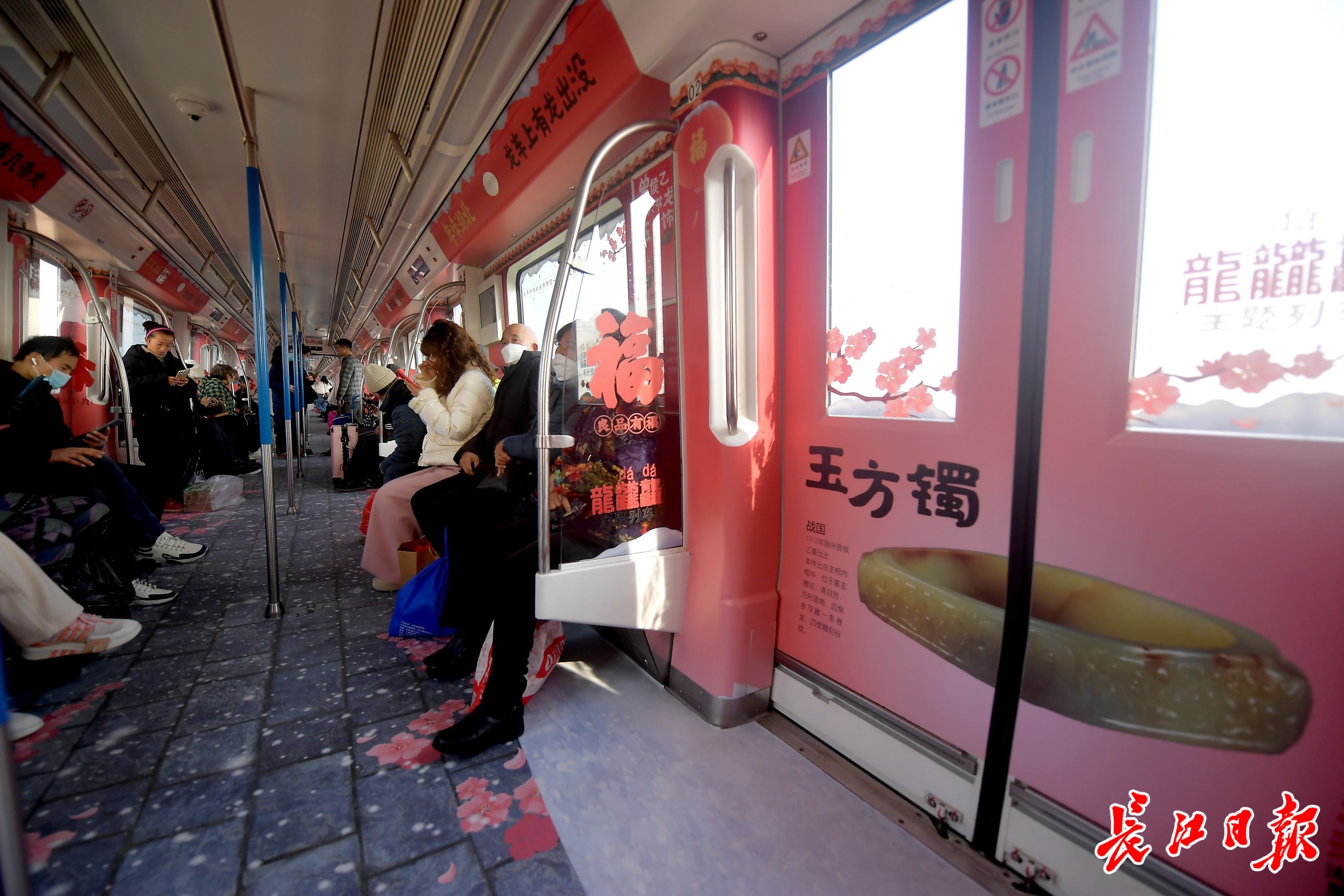 上午十点,地铁1号线黄浦路站,“龙龖龘”号缓缓进站,只见车身以代表喜庆、祥和的“中国红”为主色调,远看似卧龙,气势如虹。站台上的乘客们纷纷举起手机,拍照发朋友圈。车厢里,主打“龙出没”,且承载了浓厚的楚文化色彩。湖北省博物馆陈列展览部主任曾攀介绍,楚文化与龙相关的21件湖北省博物馆馆藏文物图案跃然于车门和看板之上,比如西周蟠龙兽面纹罍、春秋龙纹铜匜、战国曾侯乙十六节龙凤玉挂饰、战国龙形云纹玉佩、明代金镶青白玉隐起云龙纹绦环、明代金镶宝石白玉龙穿牡丹帽顶、乾隆款红彩龙纹高足盖碗等,每一件文物都有“专属名片”,让乘客沾喜气的同时也能“涨知识”。同时,车厢搭配了“有龙则灵,龙光焕发”等祝福文字,图腾、纹样等装饰也都是从21件文物中撷取的灵感元素。