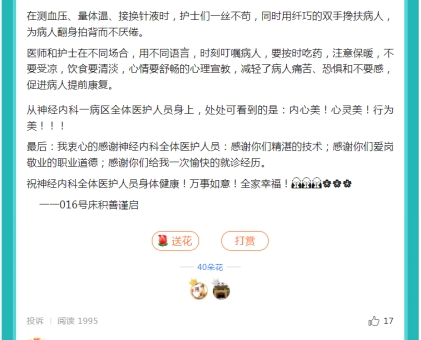 “在测血压、量体温、接换针液时,护士们一丝不苟。”“用纤巧的双手搀扶病人,为病人翻身拍背而不厌倦。”“时刻叮嘱病人,要按时吃药,注意保暖,不要受凉,饮食要清淡,心情要舒畅。”吴爷爷让家人记录着医护人员的日常点滴,生怕错过了什么,并第一时间将图文汇总、编辑、配乐,在出院前夕发送至朋友圈,把他的“故事”讲给身边人。字里行间,满载着老人的浓浓谢意和感激,图文记录着医患间的一幕幕温馨瞬间。