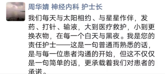 “我们每天与太阳相约、与星星作伴,发药、打针、输液,大到医疗救护,小到更换衣物,在每一个白天与黑夜;我是您的责任护士——这是一句普通而熟悉的话,是与每一位患者沟通的开始,但这不仅仅是一句简单的话,更承载着我们对患者的承诺。”看到老人特意转发的朋友圈,周华婧护士长眼睛红润起来,在自己的朋友圈置顶了这段话并感慨道,护理工作繁忙而琐碎,平凡而真实,没有昆仑之巍峨,没有大海之波澜,没有铿锵的誓言,更没有惊天动地的业绩;但护理工作,除了要有专业素养、还要有温度。