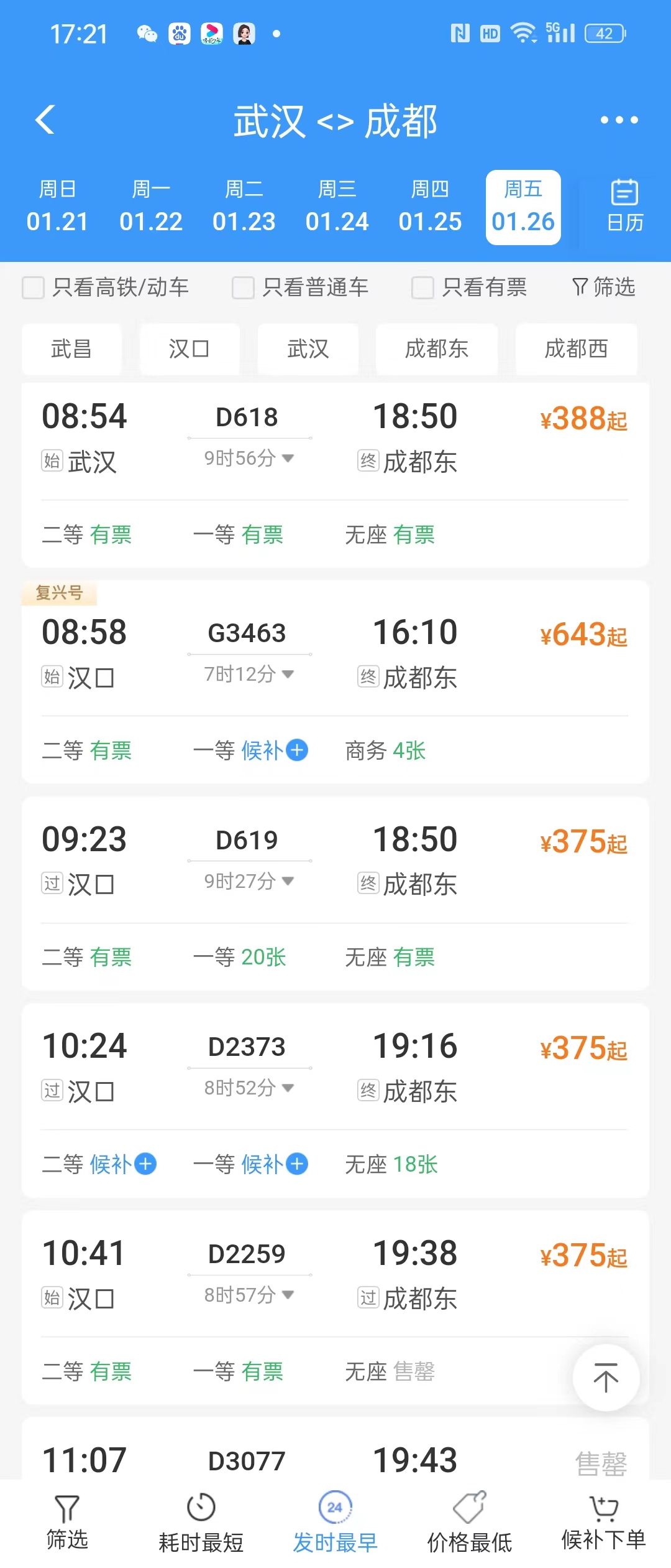 由于春运第一天距离春节假期仍有一段时间,今天热门车次的抢票难度并不大。记者打开铁路12306App,准备购买1月26日前往北京的火车票,部分车次普速硬卧车票仍有余票,高铁车次余票充足;武汉至成都1月26日下午至晚上多趟列车车票已“售罄”,上午时间段仍然可买;目前最为热门的目的地哈尔滨,上午7时50分的G1278次列车二等座显示有票。
