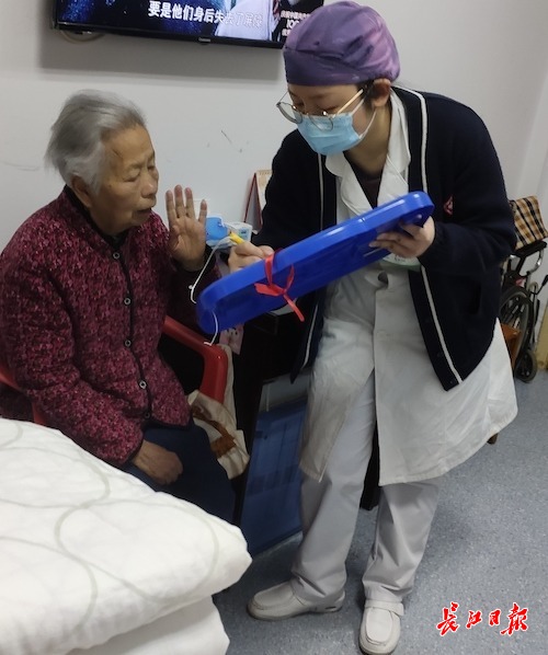 医护人员查房时都会带上小白板跟老人沟通。通讯员吴萍 摄