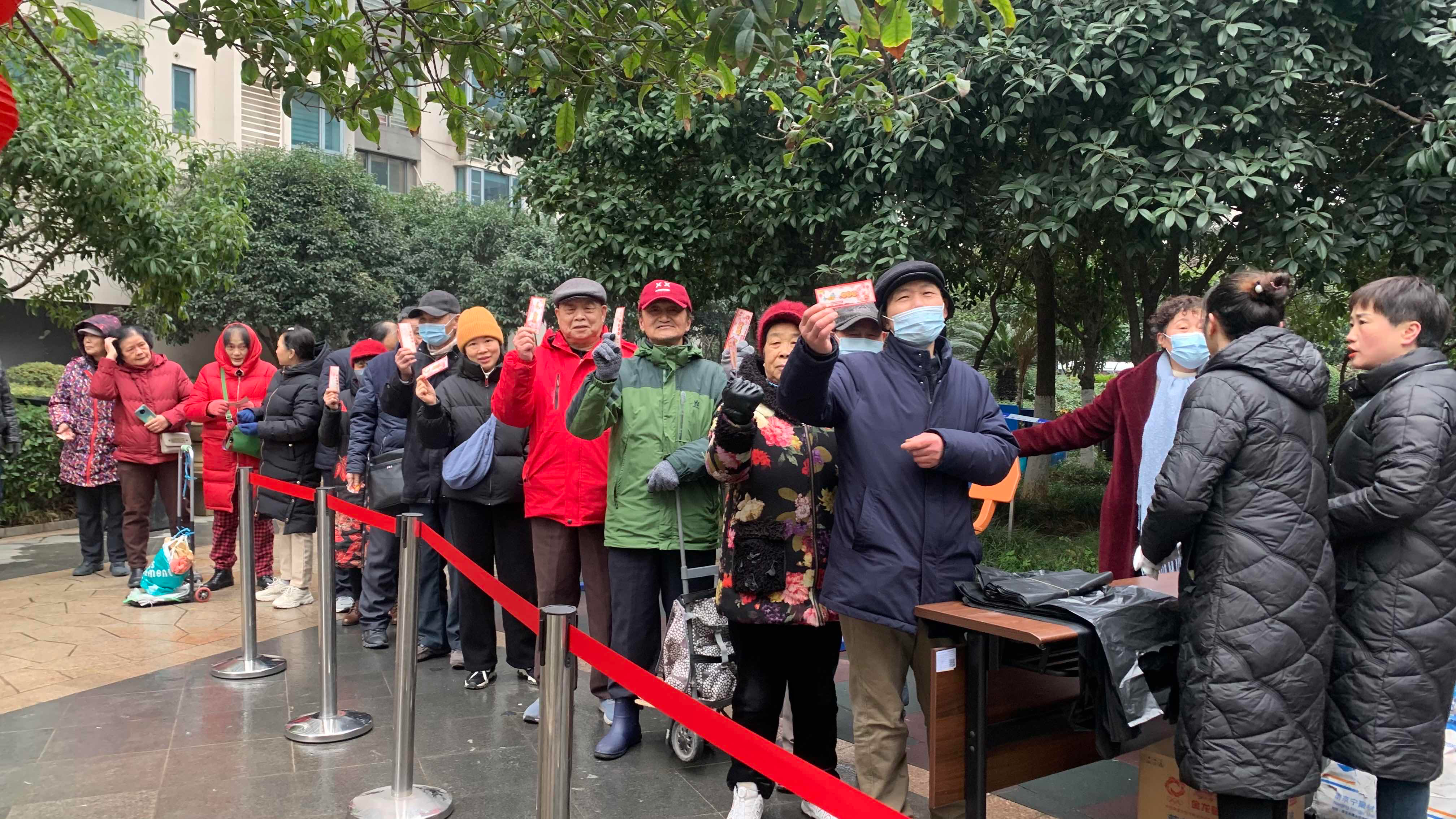 社区书记张慧琼说:“东湖春树里小区是2000年建成,过去两年送鱼的活动都是物业公司自己做,在今年社区特别融入了武昌区书画协会送春联和便民服务等元素。”