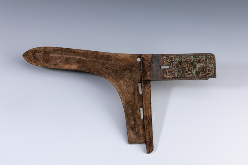 荆州余家瓦屋墓地战国嵌绿松石错金纹铜戈,戈内部正反面均有错金纹饰。一面为两组变形龙纹,龙体轮廓用错金线条勾勒,其间镶嵌绿松石块;另一面饰繁缛的勾连云纹。