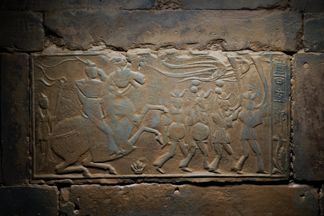所展出的襄阳王寨墓地南北朝五音直郎画像砖,砖面采用浅浮雕和阳线技法,右侧榜题“五音直郎”四字,属湖北地区首次发现。画面之中,男子驾马而行,马蹄高扬若奔;仪仗队伍中,前有乐工吹角击鼓,后有侍从跟随而行。王寨墓地317块出土画像砖,题材包含神话、典故、孝子、生活等,“小舆大驾行”“牵诞马”榜题等画像砖属湖北地区首次发现。