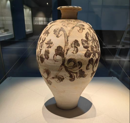 造型秀美,口细颈短,肩极宽博,通体于白色素胎上满绘褐彩纹饰,具有北方磁州窑系特点。出土于黄梅康家垄墓地M1,墓主名为黄蔚,字文叔,生于北宋真宗大中祥符二年(1009年),卒于北宋英宗治平三年(1066年),是目前湖北地区发现最早的北宋纪年墓。(荆州博物馆供图)