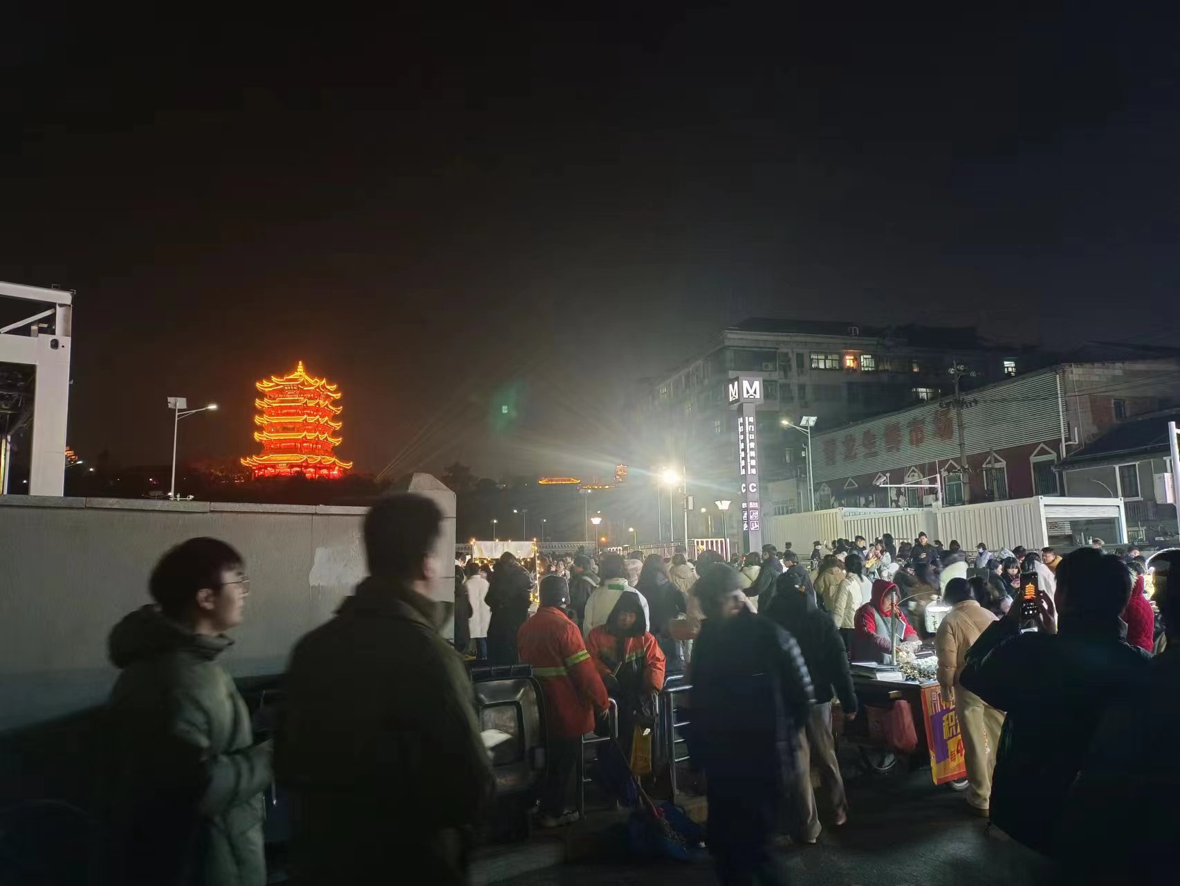 1月22日晚上,地铁5号线司门口黄鹤楼站C出入口的红墙前,游人如织。