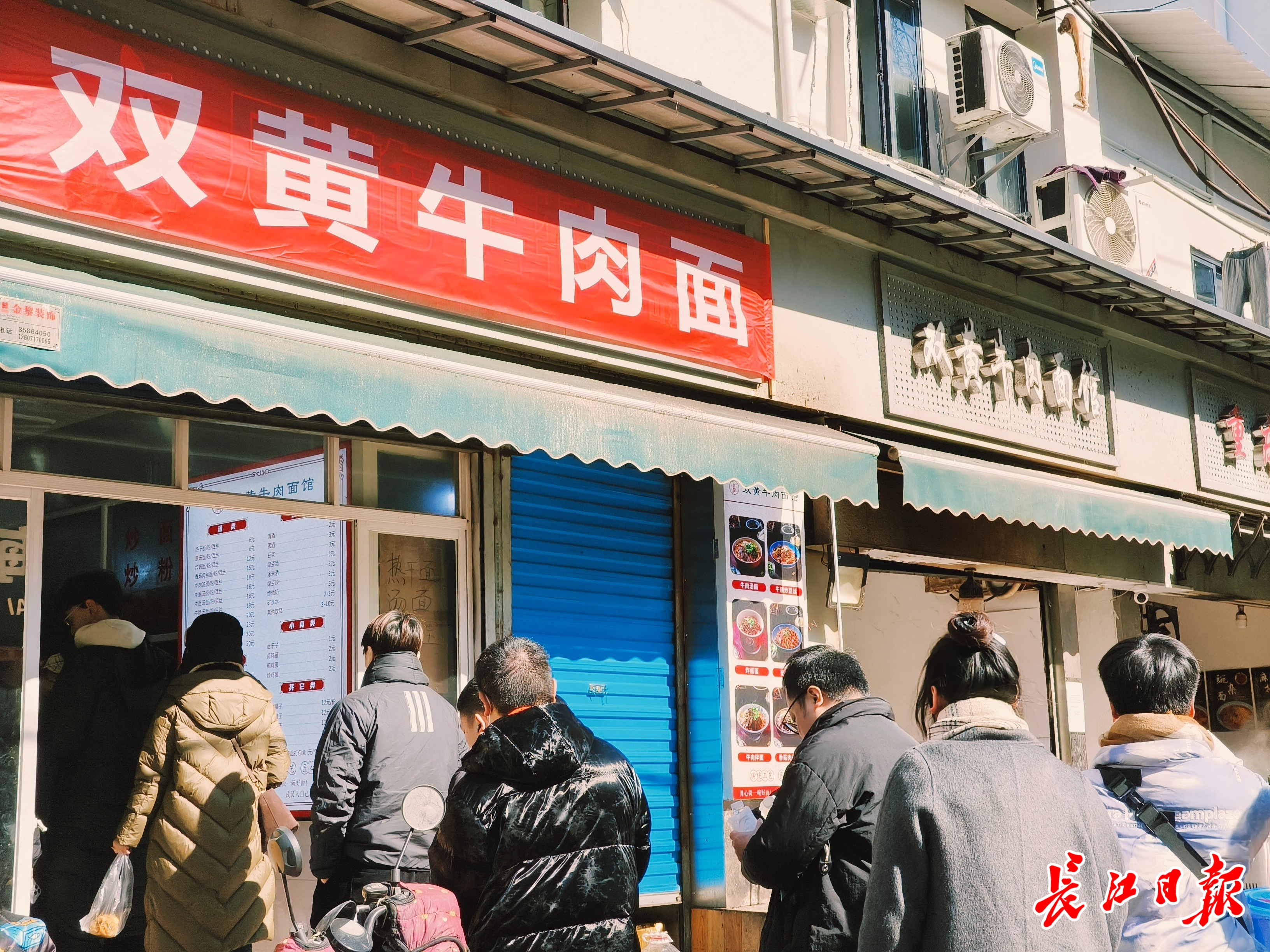 山海关路上的双黄牛肉面店门口人们排队吃面。记者黄丽娟 摄