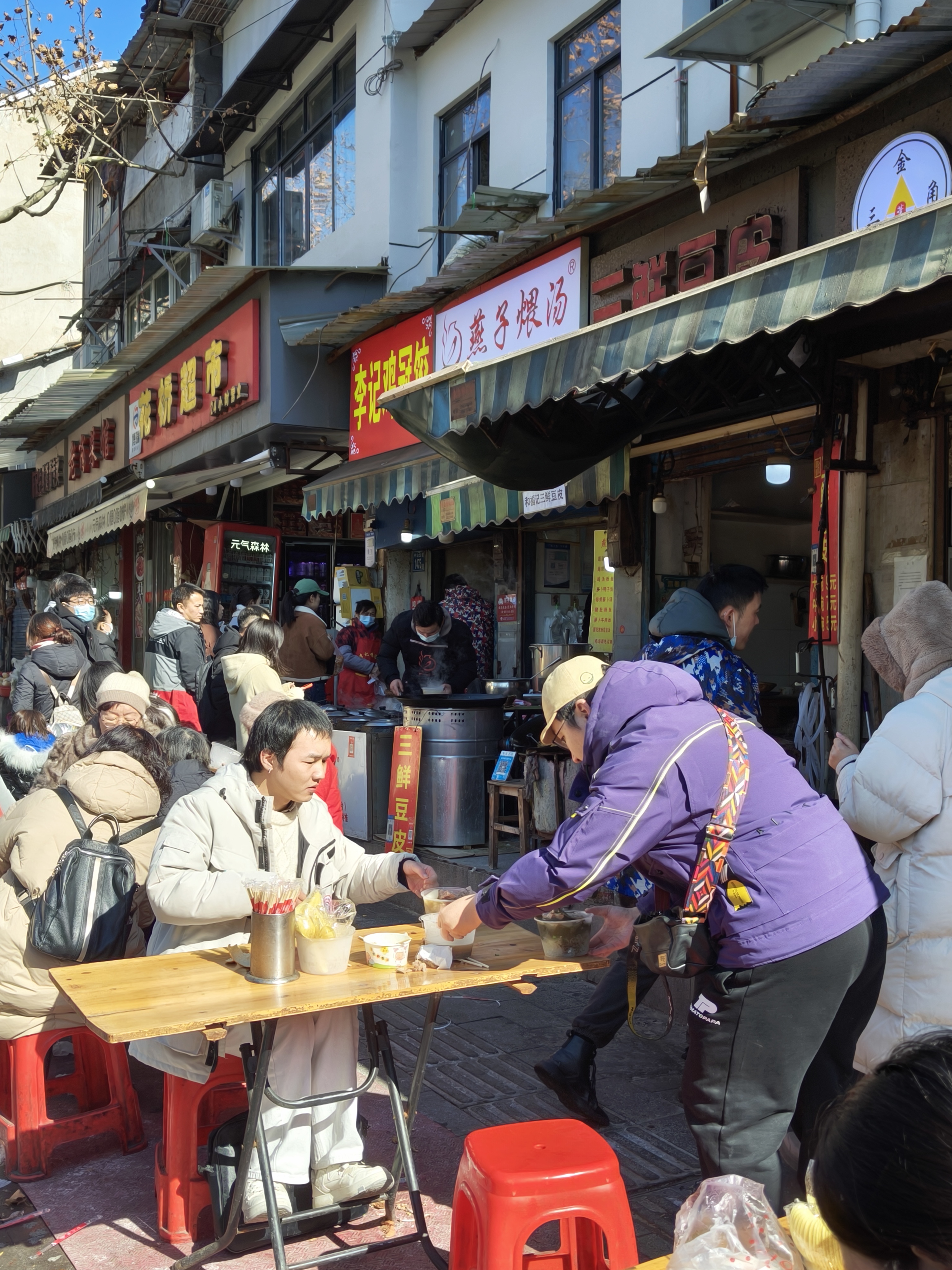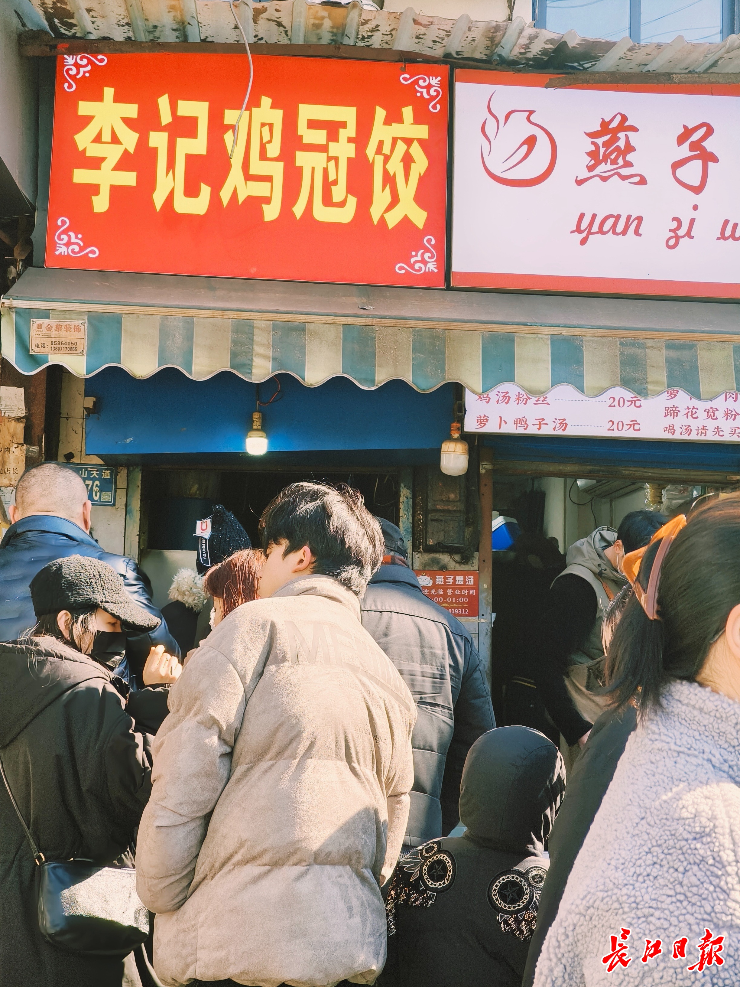 1月23日中午,在山海关路,长江日报记者看到,李记鸡冠饺、双黄牛肉面、金三角煨汤馆等网红美食店都排起长队。“从上周起,明显感觉外地大学生多起来,很多年轻伢来了后,先拍照,再买吃的。”和福记三鲜豆皮的王老板笑呵呵地说,“今年生意不错。感觉大学生都来武汉旅游了,天南海北的口音都有。你看斜对面那家卖藕粉的摊子才来没多长时间,天天也排队,生意很好。”来自无锡的大四学生小苏和同学两人买了一份鸡冠饺、一份豆皮、一份藕汤,分着吃。“我们沿着高铁开启寒假之旅,在武汉待两天,昨天去了粮道街,今天就准备在汉口逛逛老城区,感受下这里的风土人情。明天我们就去重庆了。”中午1时30分,汪记鱼糊汤粉已经卖完,店家准备收摊。“最近每天早上6点就有大学生拖着行李箱来买早餐了,一般8点就会开始排队,到中午基本上就卖完了。”