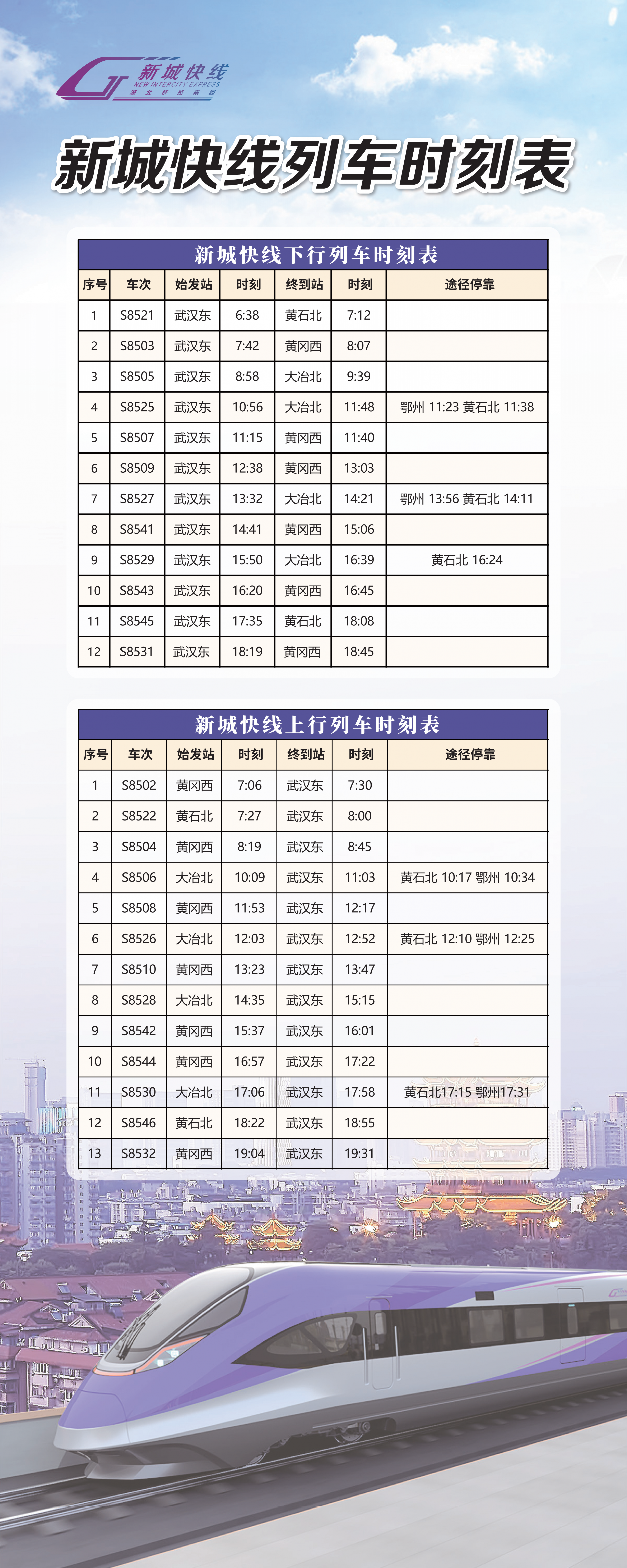 据悉,“新城快线”列车以武汉至黄石、武汉至黄冈两条城际铁路“公交化”运营为载体,目前设大冶北站、黄石北站、黄冈西站、鄂州站、武汉东站等办理站。两条城际铁路一天共开行12.5对,武汉东到黄石北最早一趟为6:38,到黄冈西最早出发时间为7:42。按照大站必停、小站交错停的运营模式,武汉至黄石全程平均时间在42分钟以内,高峰时段最短时间为30分钟。
