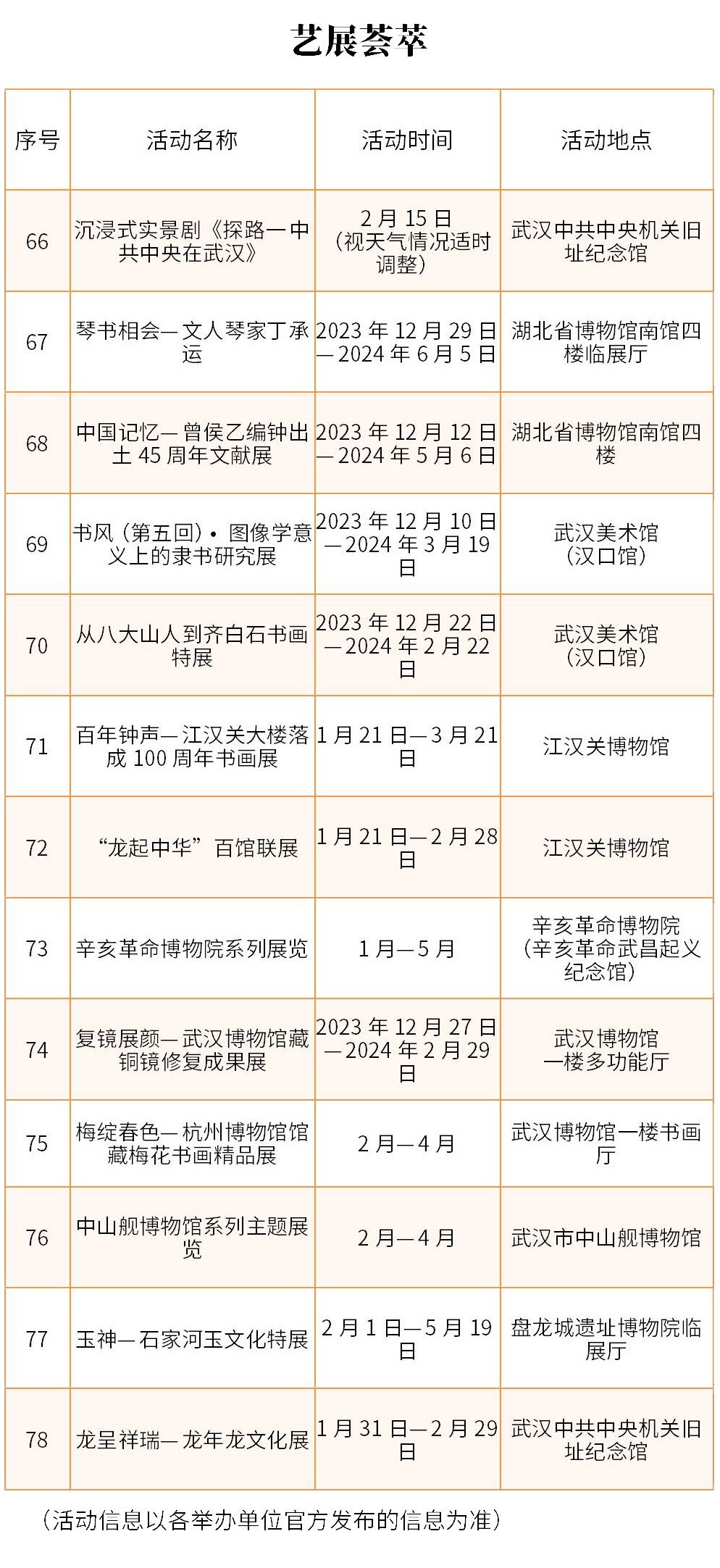 五是艺展荟萃板块。以沉浸式演艺、各种特色展览为主打。包括武汉中共中央机关旧址纪念馆推出的沉浸式实景剧《探路—中共中央在武汉》,《龙呈祥瑞—龙年龙文化展》,武汉美术馆《从八大山人到齐白石书画特展》、江汉关博物馆《“龙起中华”百馆联展》、武汉博物馆《喜上眉梢·梅花书画精品展》等展览活动。