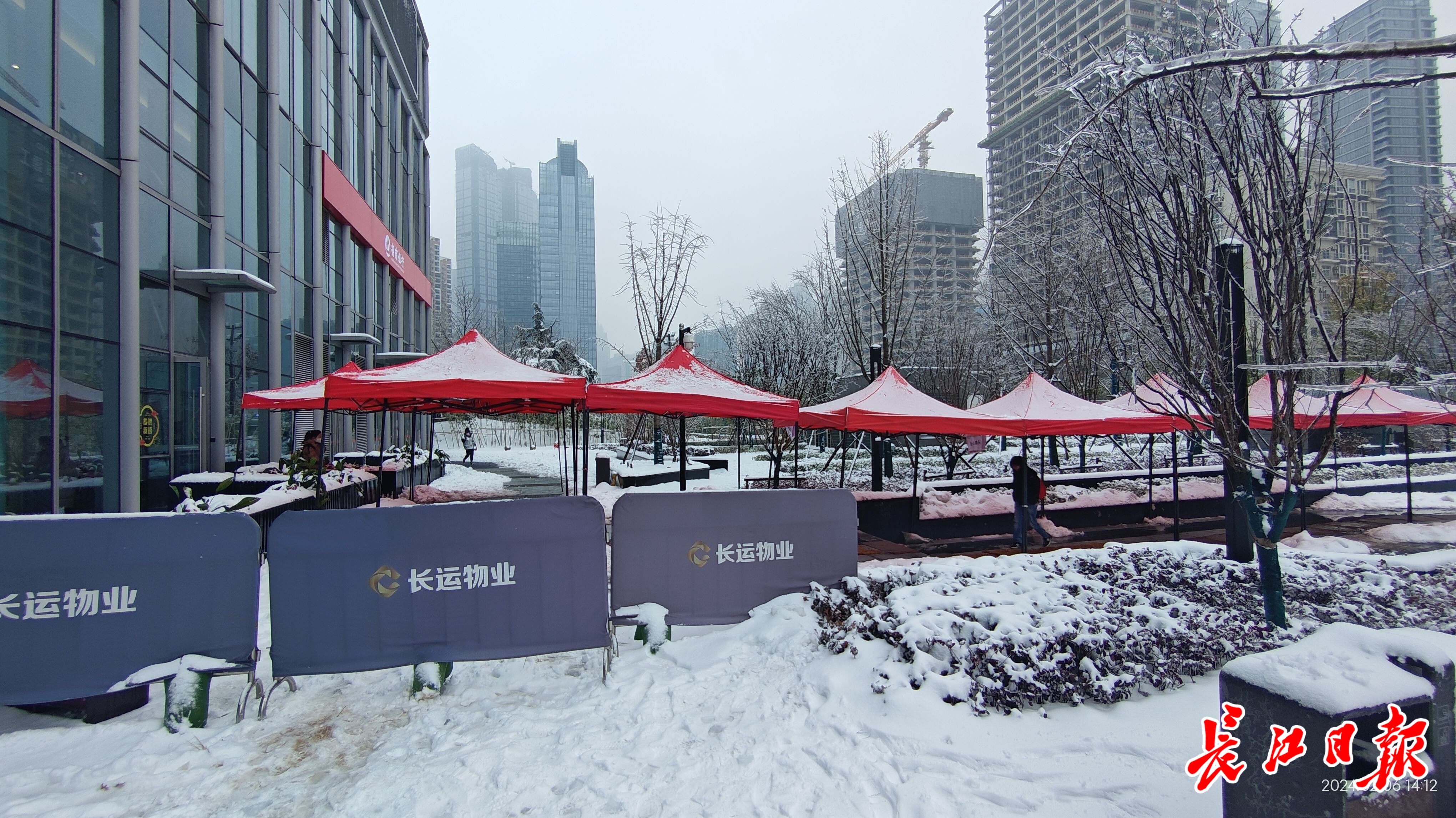 大厦物业项目经理方君君介绍,这栋大厦日均上班人数约为1500人左右,进出人数多,安全保障特别重要。这次低温冷冻天气到来后,大厦外墙挑檐及一些中间层装饰外檐上的冰锥会不时坠落。为了预防掉落的冰锥伤人,长江产业大厦一方面积极除雪化冻,在确保安全的情况下定期铲除屋顶冰凌,均匀铺撒工业盐,减少安全隐患;另一方面,加强人员出入的引导,封闭有安全隐患的出入口,在地铁与大厦沿途搭建帐篷、铺设防滑垫,形成保护带,便于行人通行。此外,他们还建立了临时快递点,以减少人员外出步行。