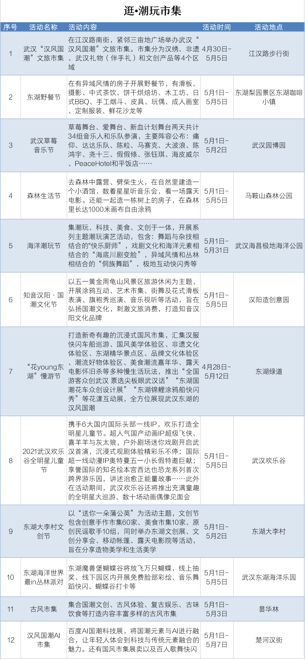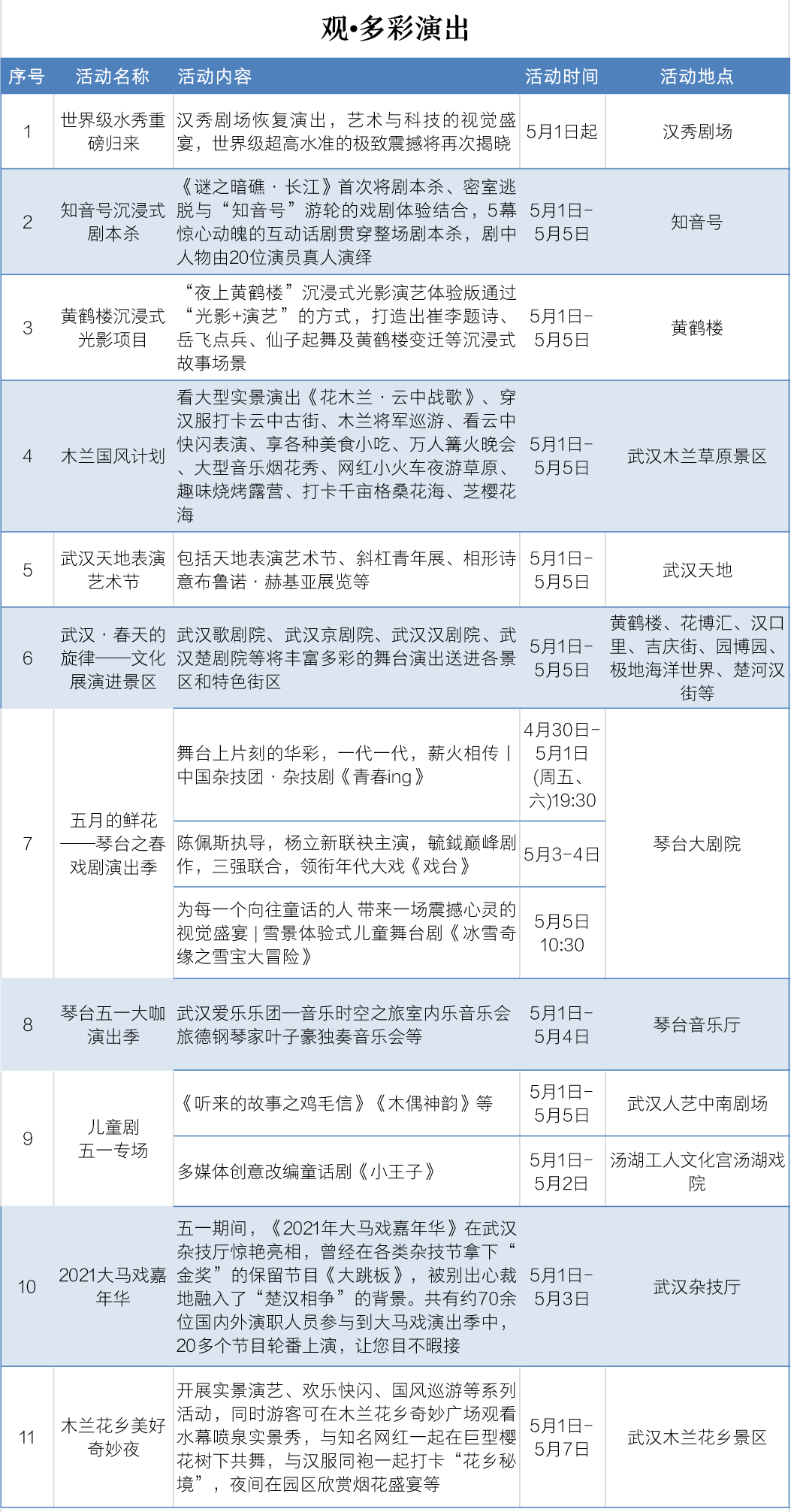 长江日报记者从发布会上获悉,按照市委市政府的统一部署,为丰富市民游客假日生活,促进文化和旅游消费市场繁荣,打造武汉特色文化和旅游品牌,推动文旅产业高质量融合发展,助推武汉“五个中心”建设,2021年“五一”假期,武汉将推出以“英雄之城 大美武汉”为主题的十大板块活动。目前,十大板块60项140多场活动已准备就绪。