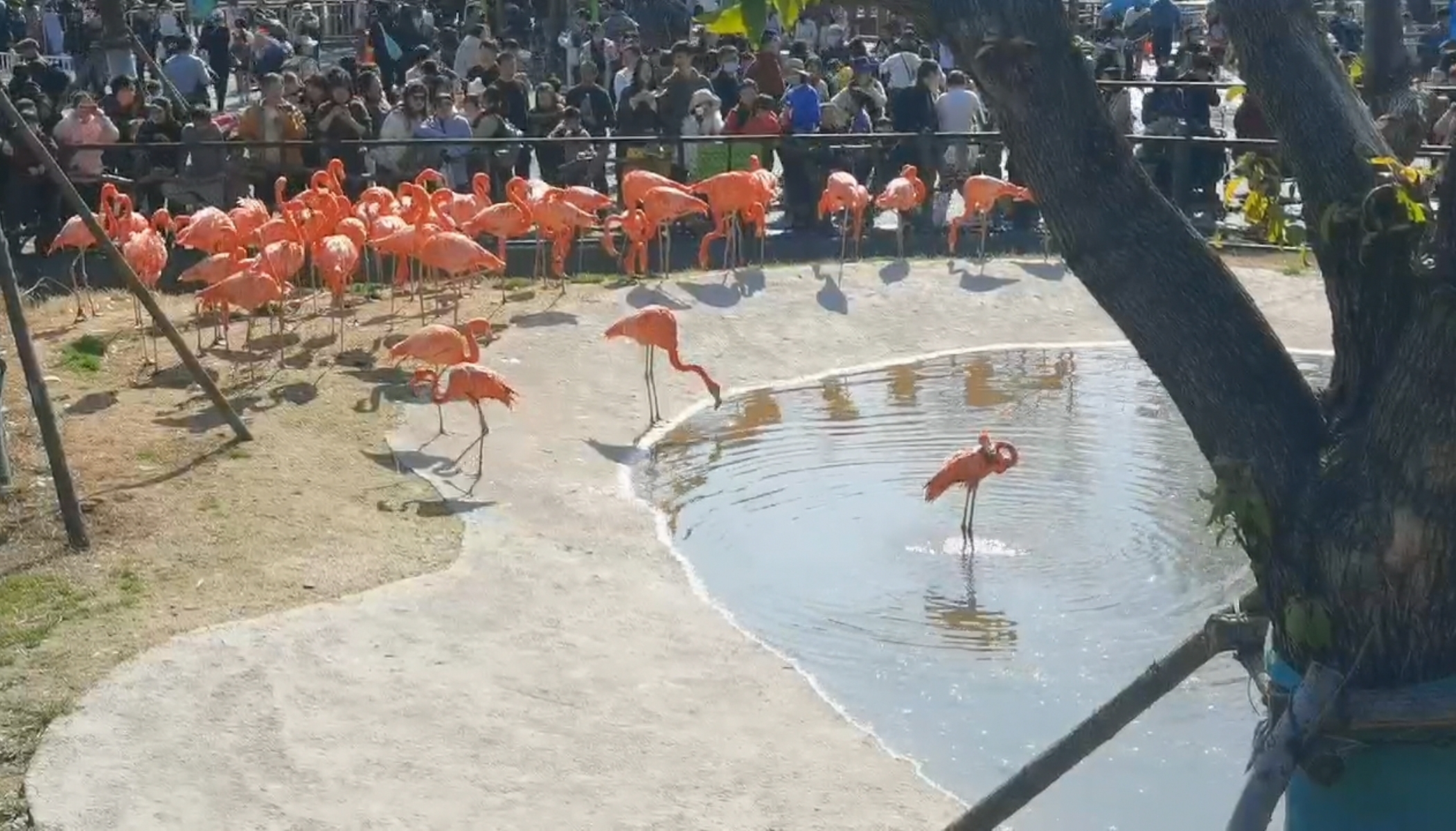 2023年9月,武汉动物园重新开园。这个春节也是新动物园开园迎宾的第一个春节。偌大的动物园里,很多动物懒洋洋地晒着太阳,也有很多动物兴奋地跃来跳去。金丝猴打闹着飞越游人的头顶,脚步震得棚顶“砰砰”直响,底下的游人发出“哇”的惊叹;南美巨嘴鸟歪着脑袋,瞪着圆圆的眼睛观察着来来往往的游人;灵长界“杀马特”黑叶猴挂在绳子上荡秋千,向游人展示着它的杂耍天赋……珍稀动物出现的地方也总是围满了好奇的人。熊猫竹海因为人流量太大,保安不得不分段放入,馆内两只熊猫,一只在室外木台上晒着太阳,沉沉睡去,一只则躲在室内的石柱后,只露出两只耳朵,调皮地一动一动。