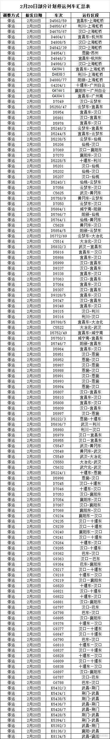 据@武汉铁路 :根据中央气象台发布的寒潮橙色预警,2月18日至24日,我国大部地区将出现大范围雨雪冰冻天气。为确保旅客出行安全,中国铁路武汉局集团有限公司2月20日计划停运部分列车。铁路部门将根据天气变化动态调整旅客列车运行方案,以上车次可能继续发生变化。具体情况请旅客随时通过中国铁路12306网站或App、各火车站官方微博等渠道关注动态信息,妥善安排出行。