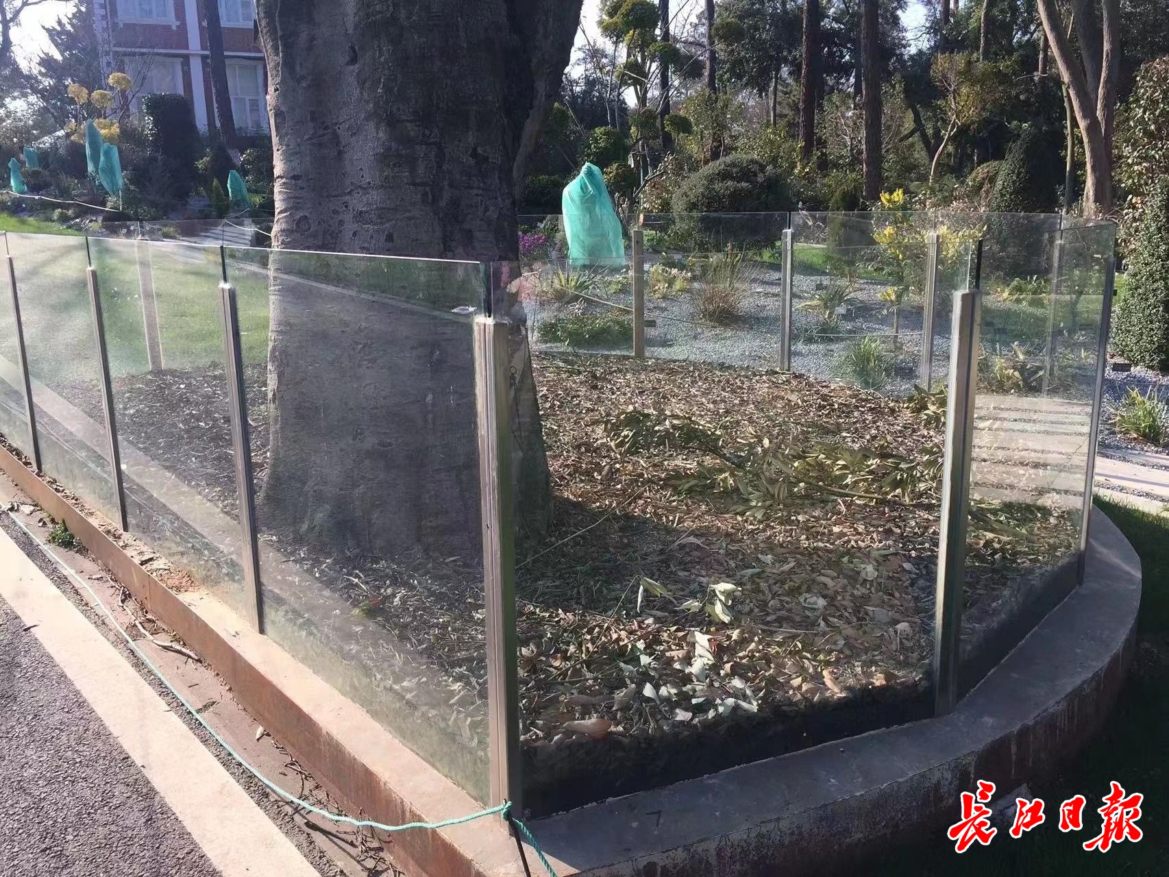 记者注意到,这几处玻璃护栏并非全部都是透明的,其中围住大树的三处护栏玻璃上贴有树木介绍文字和相关图案。
