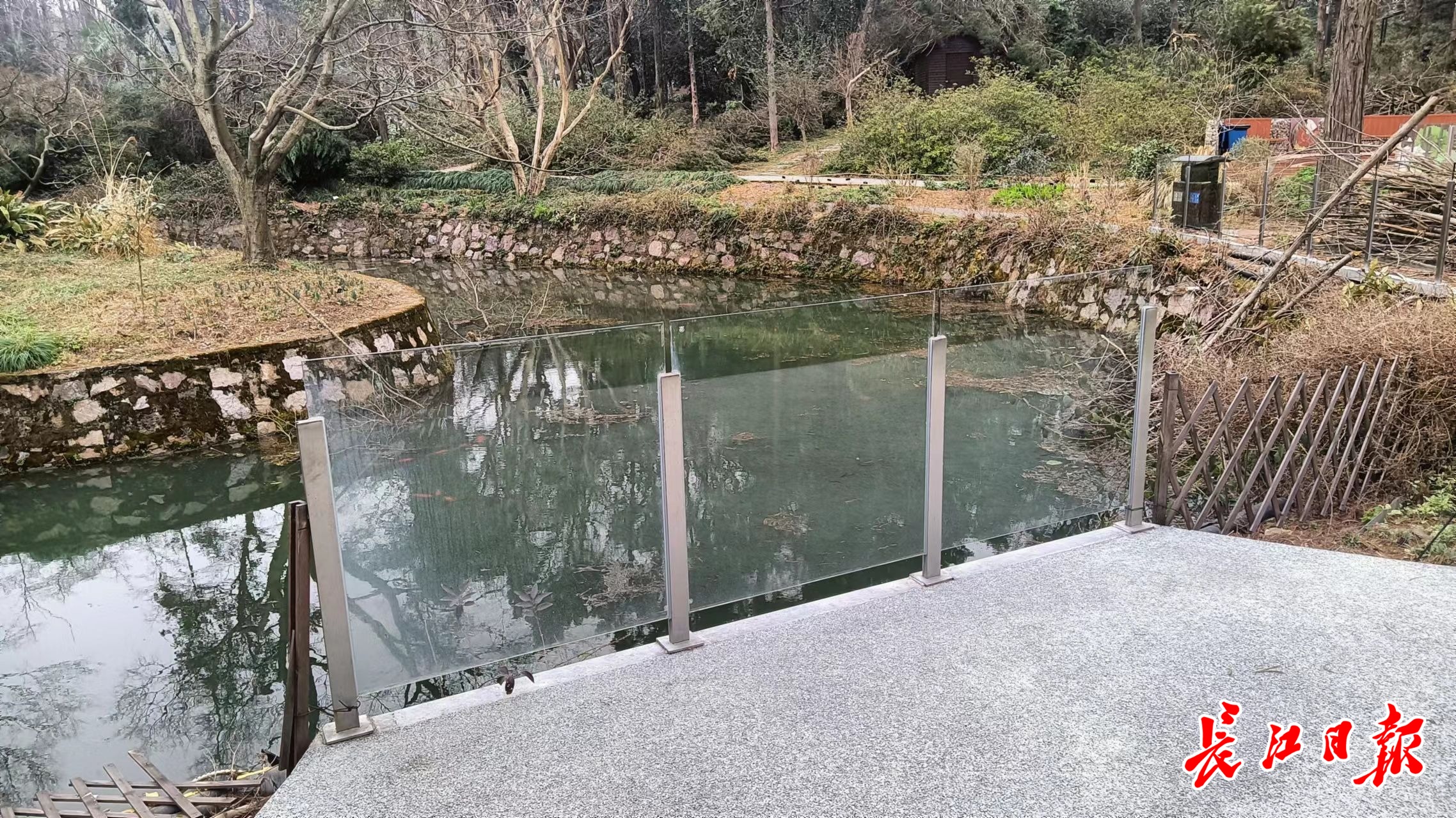 市民张先生称,春节假期,他和爱人一起前往武汉植物园参观,发现在园内花境大道附近的树林内、水渠边设置了好多处玻璃护栏,玻璃护栏大都是一米多高,大部分玻璃光洁透明。