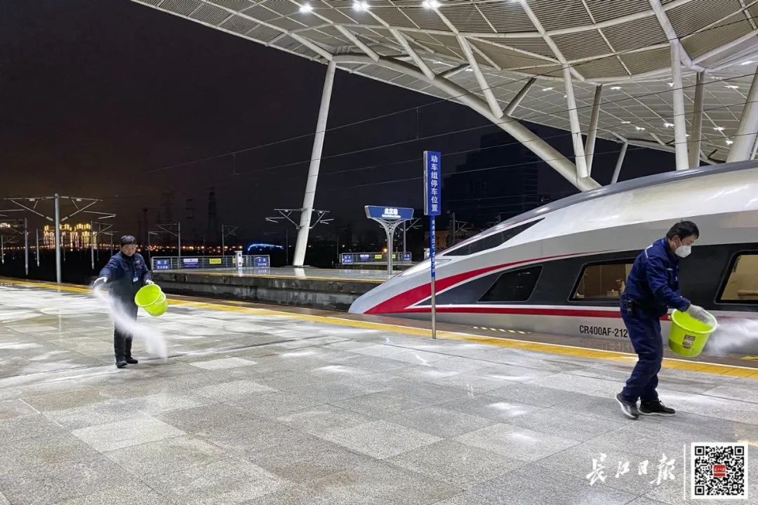 武汉站站台,工作人员抛撒工业盐。记者胡冬冬 摄