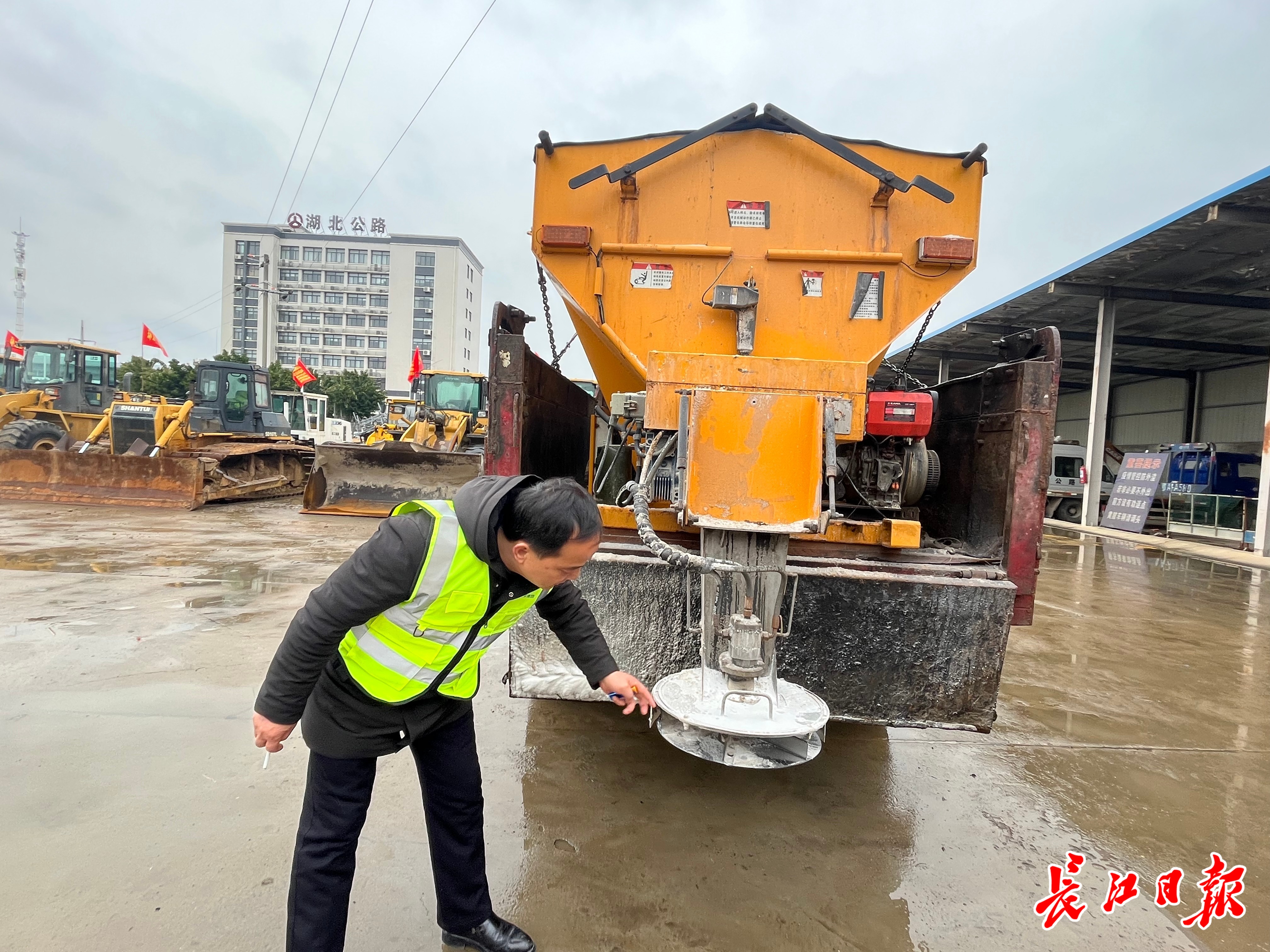 企业工作人员检查融雪撒布车运转情况。 记者汪丽婷 摄