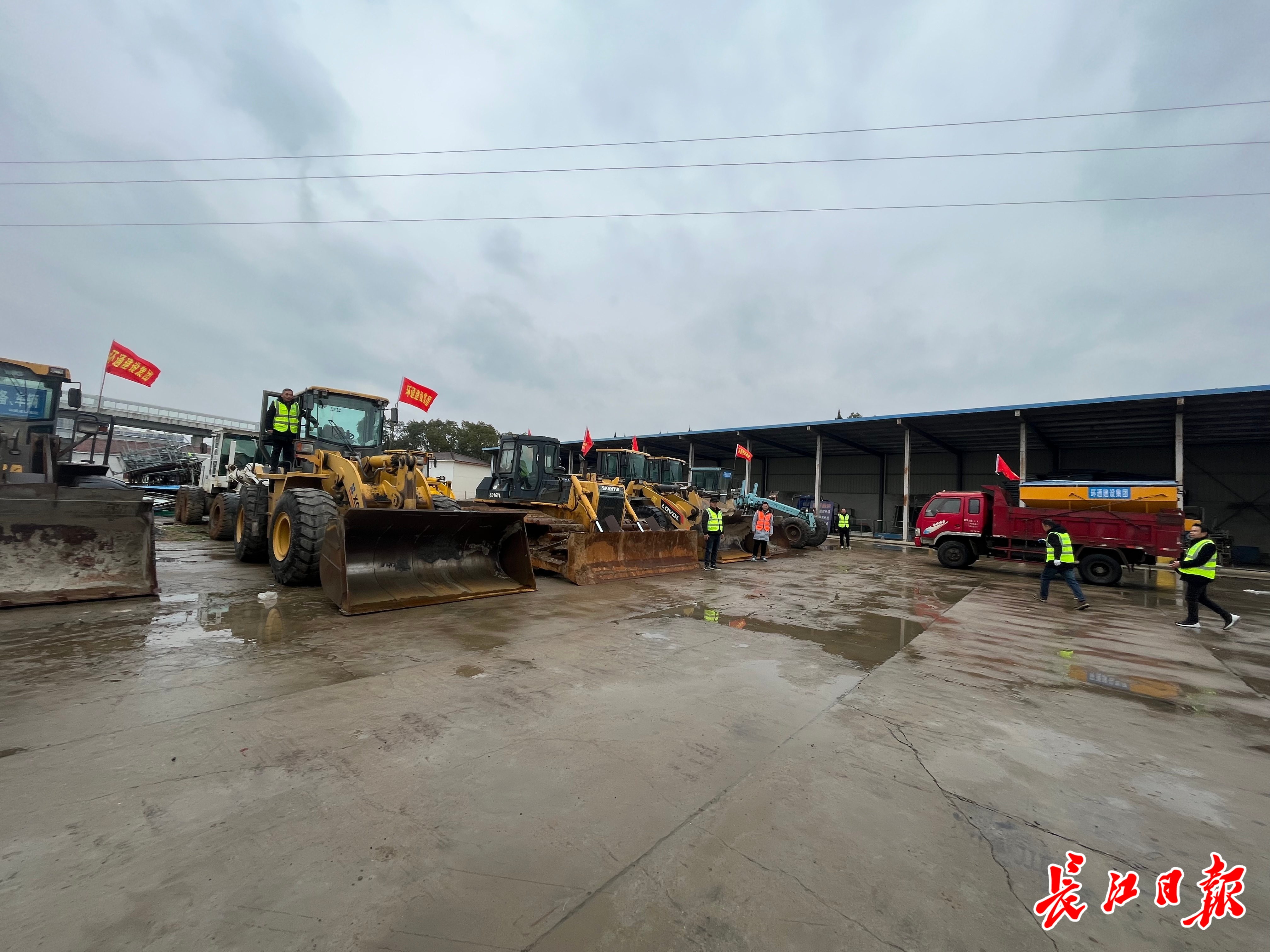 项目部现场,装载机、平地机、推土机等机械车辆列队成行,驾驶员也集结待命。 记者汪丽婷 摄