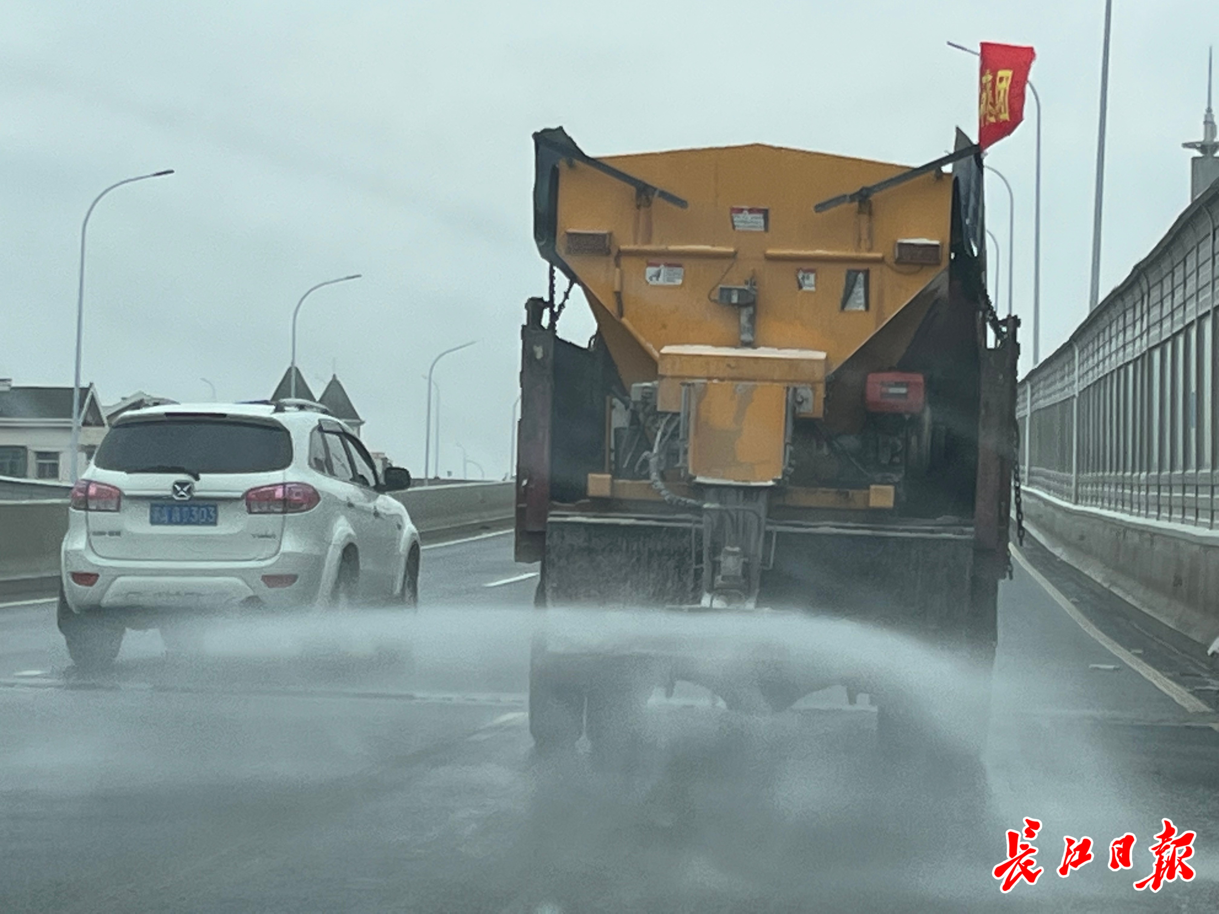 融雪撒布车在道路上作业。 记者汪丽婷 摄